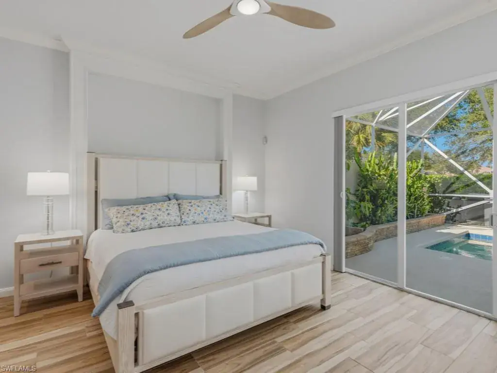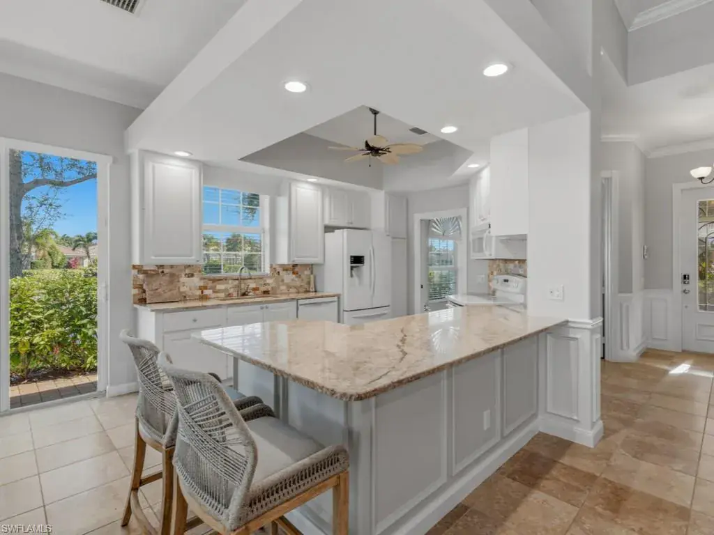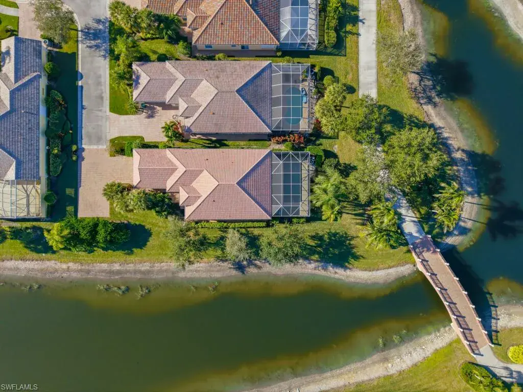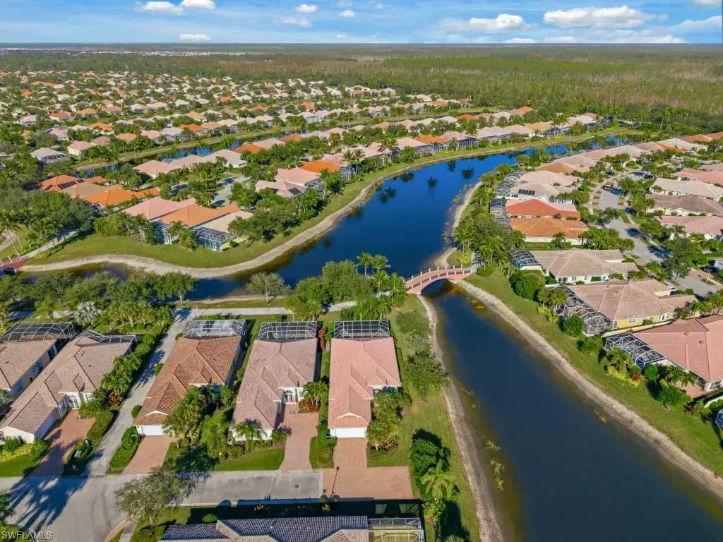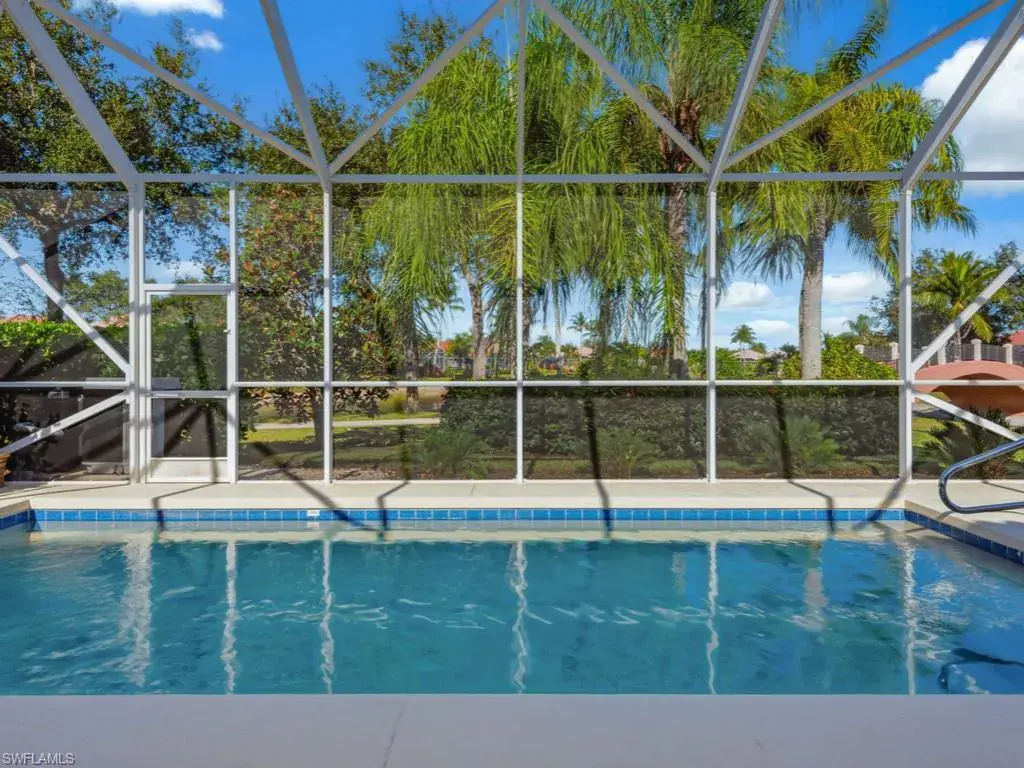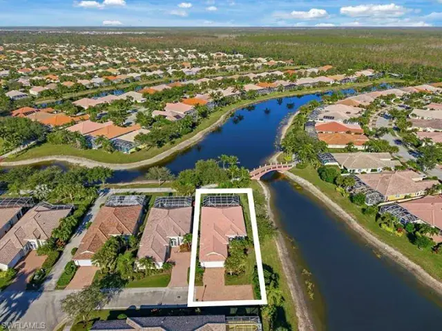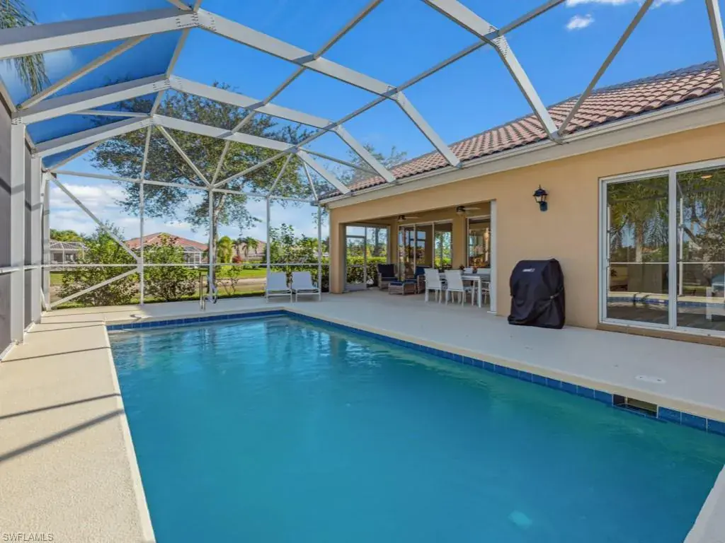 Tucked on a quiet cul-de-sac on one of the best lakefront lots in Verona Walk, this immaculate Oakmont is the one you’ve been waiting for. Southern exposure bathes the home in sunshine and delivers sweeping water views from the moment you open the front door. Through the covered entry discover an open concept layout with soaring volume ceilings flooded with abundant natural light throughout. The chef’s kitchen offers white wood cabinetry, granite counters, and a center island with breakfast bar open to the dining area and great room. The three spacious bedrooms include a luxurious primary suite with dual vanities, a soaking tub, separate shower, and two expansive walk-in closets. Two additional full baths and a versatile den/office ensure comfort for all. Unwind in your own private backyard oasis with sparkling saltwater pool, lush tropical landscaping, and screened lanai. Enjoy resort-style living with Verona Walk’s incredible amenities: a 26,000 square foot town center, resort and lap pools, tennis, pickleball, fitness center, restaurant, gas station, post office, and ice cream shop. Miles of walking/biking trails are all connected by picturesque Venetian bridges. Low HOA fees, manned gated entry, and a prime Naples location just minutes from Marco Island beaches and 5th Avenue shopping make this a superb choice.