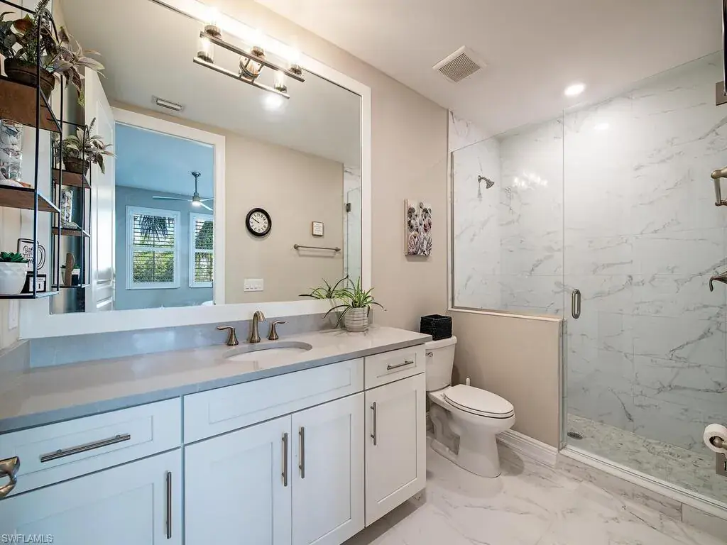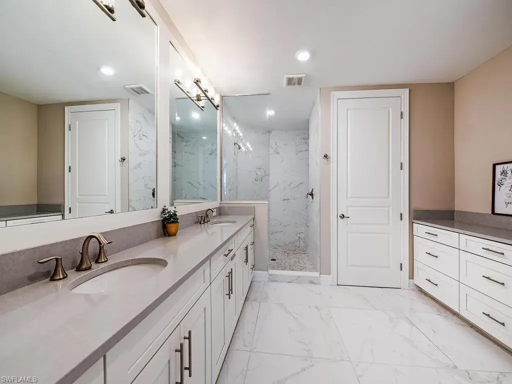 The home features 32×32 polished porcelain tile in soft white and gray tones, tray ceilings, and designer lighting that elevate every space. The chef’s kitchen is beautifully appointed with a gas range, wine cooler, and custom cabinetry, perfect for both cooking and entertaining. Each bathroom is thoughtfully designed with elegant cabinetry, frameless glass enclosures, and floor-to-ceiling tile.