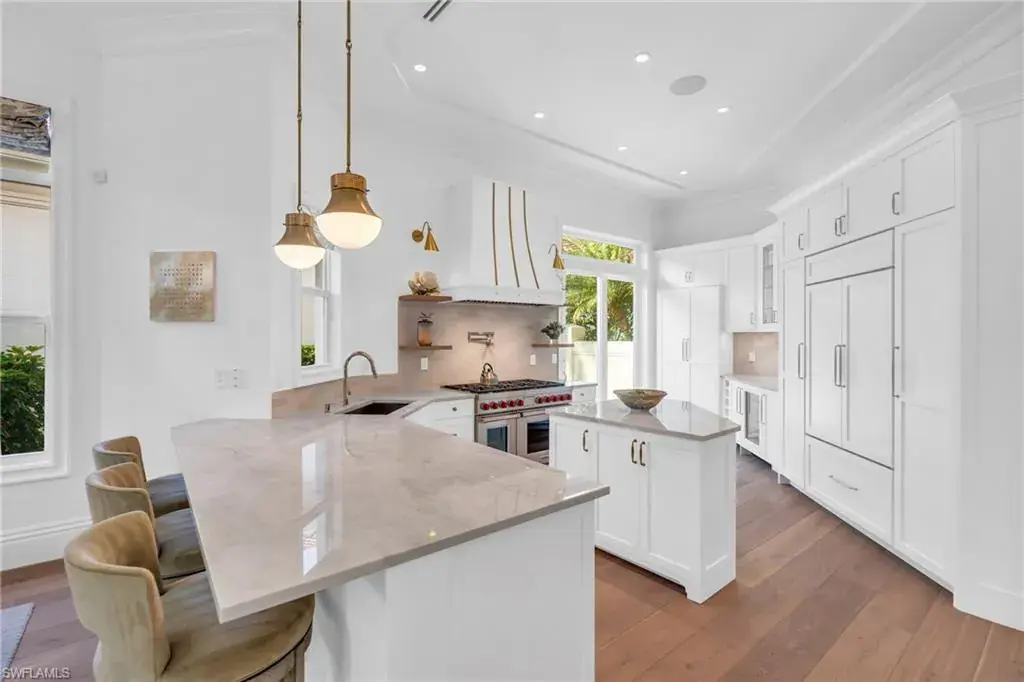 Nestled in the exclusive enclave of Villa La Palma at Bay Colony, this stunning two-story home offers an unparalleled blend of luxury, privacy, and effortless living. Thoughtfully remodeled down to the studs, this meticulously maintained residence spans nearly 4,000 square feet and embodies warmth and sophistication at every turn. Its coveted southwestern exposure bathes the home in natural light throughout the day, with breathtaking views of the serene waterscape providing a picturesque backdrop to the expansive pool and spa area. Step inside to discover a spacious and inviting layout, featuring four elegant bedrooms, each with its own en-suite bathroom, and a versatile loft that can function as a den, office, or additional sleeping quarters. The primary suite is a private retreat, boasting a spa-inspired, newly renovated bathroom with dual vanities, an oversized walk-in shower with multiple showerheads, and a luxurious soaking tub—creating the perfect sanctuary for relaxation. The heart of the home is the chef’s kitchen, which has been completely upgraded with top-of-the-line appliances, including a Wolf gas cooktop, Subzero paneled refrigerator, and dishwasher. The kitchen also features new countertops and ample storage, making it a culinary enthusiast’s dream. Additionally, you will find two sub zero built in ice makers. Entertaining is made effortless with a separate dining area and sliding glass doors that seamlessly connect the indoors to the poolside oasis. This villa offers an array of modern amenities, including hurricane-rated windows, automatic lanai screen shutters, new sliding glass doors, and a new pool heater. No details were overlooked, including the unique panoramic pool screen, which provides a clear view of the lush landscaping and waterscape. The two-car garage, outfitted with new epoxy flooring, built-in refrigerator/freezer and built-in enclosed custom cabinets, provides ample storage for vehicles and prized possessions. Additionally, the property is equipped with a new underground propane tank that supplies gas lines to the oven, outdoor grill, and allows for a future gas hot tub heater. Living in Villa La Palma is the epitome of luxury living with homeowners’ association coverage for essential services such as cable/internet, landscaping, and pool maintenance, offering all the benefits of single-family living without the hassle. Residents of Bay Colony enjoy exclusive access to the private Bay Colony Residents Only Beach Club, a newly updated tennis center, plus all the coveted amenities of Pelican Bay, including pristine beaches, scenic nature trails, and a lifestyle of unrivaled elegance. Ideally located just minutes from the upscale shopping and dining experiences at Mercato and Waterside Shops, this villa presents an extraordinary opportunity to experience the very best of Naples luxury living. Don’t miss your chance to own a piece of paradise in one of Naples’ most prestigious communities.