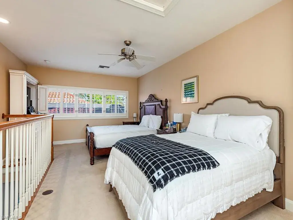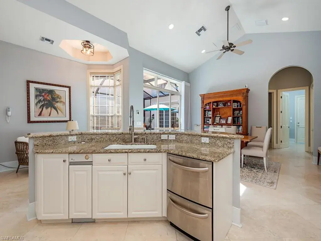 A find. A perfectly-proportioned, intelligently-priced, single-story main house with quality finishes, significant updates and sophisticated design, 3,377 sq. ft. under air, offering the perfect combination of private and public space, indoors and out. This villa is situated on The Villas La Palma’s western cul-de-sac, a very private location in the community and a property not damaged by flooding; FEMA maps show this property in the X500 flood zone. The home’s southwestern exposure means many hours of sun on the freeform pool, the expansive paved deck with multiple entertainment areas and the spa. Of note in the main house: a grand master suite with large walk-in shower and beautifully fitted master closet (85 sq. ft.), a large salon with 15’ volume ceilings, and, adjoining the well-appointed kitchen, a large dining/family room area. Also,one spacious guest bedroom, ensuite, with fitted walk-in closet; a study with views of the entry courtyard and pool; a smaller guest suite suitable for a bedroom but now used as a fitness space; and, a third, full bath. The roof was replaced in 2014. In the separate two-story cabana/guest house with private access from the entry courtyard, a spacious first-floor living room with kitchenette and full bath and, on the second floor, a large bedroom loft (350 sq.ft.) with additional space for a sitting room or office.