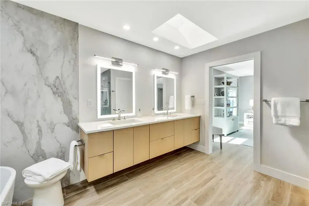 The villa’s new layout seamlessly blends indoor and outdoor living, with generous room proportions and high-quality finishes throughout. The first floor primary bedroom suite boasts a luxurious ensuite bath and ample closet space. Also, on the first floor, an additional bedroom with ensuite bath. The second floor has two additional bedrooms and another bath that provide comfortable accommodations and privacy for family members or guests.