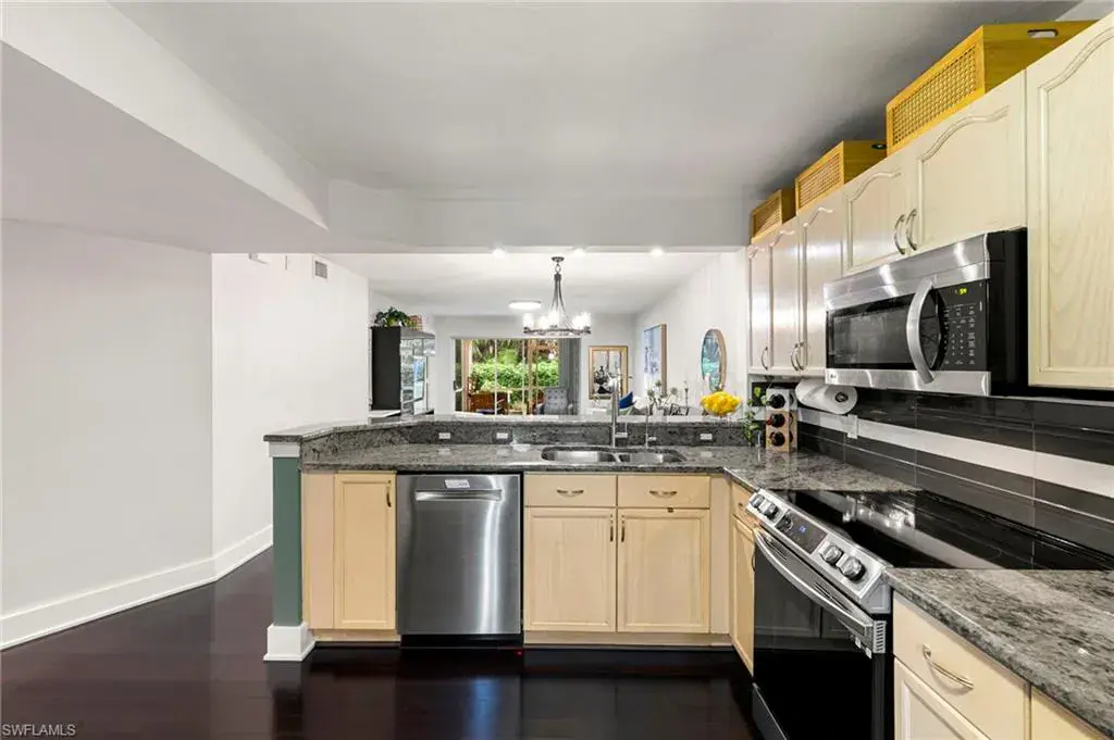 Discover the perfect blend of modern luxury and unbeatable convenience in this beautifully updated first-floor condo in The Villages of Emerald Lakes. Step inside to find rich, dark wood floors flowing through a bright (thanks to the updated LED lighting), open-concept living space, made possible by the thoughtful removal of a wall in the kitchen. The updated kitchen is an entertainers delight, featuring granite countertops, a stylish backsplash, stainless steel appliances, and a pantry for ample storage.