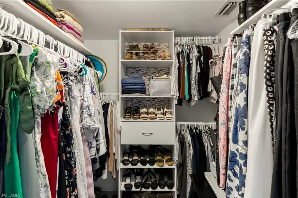 In the spacious primary suite you’ll find a custom walk-in closet and a gorgeously remodeled ensuite bathroom that feels spa-like with a large vanity, built-in linen storage, and a floor-to-ceiling tiled walk-in shower.