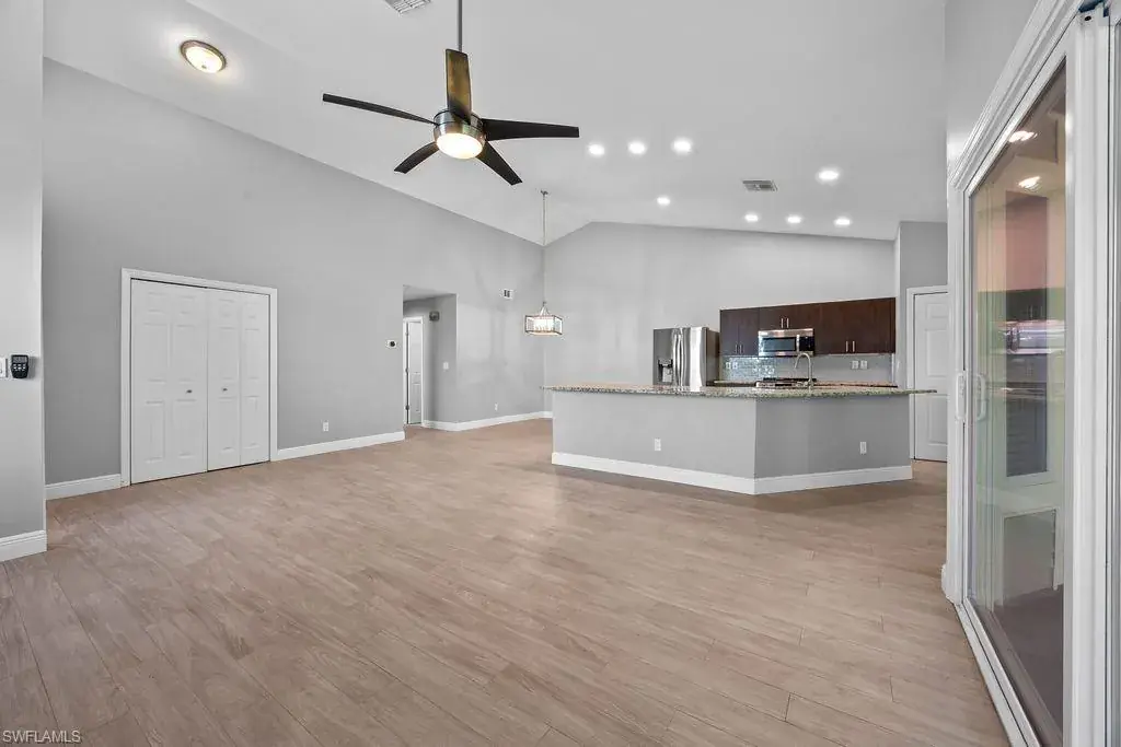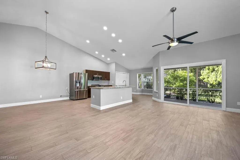 The list of upgrades is long: brand-new appliances (2024), a new roof (2024), impact windows and sliders (2024), a tankless water heater, newer AC, and recessed lighting throughout.