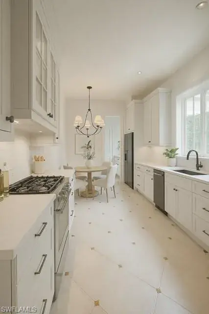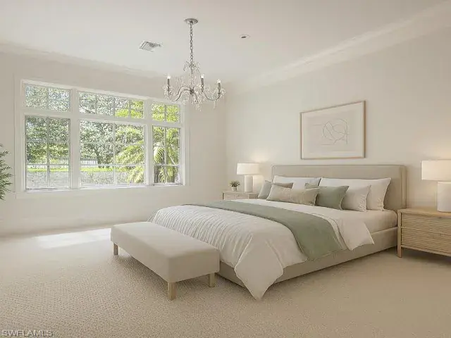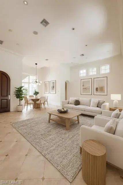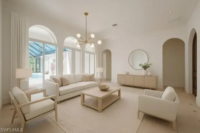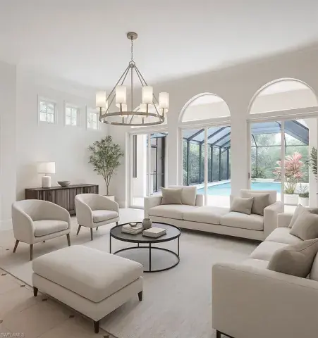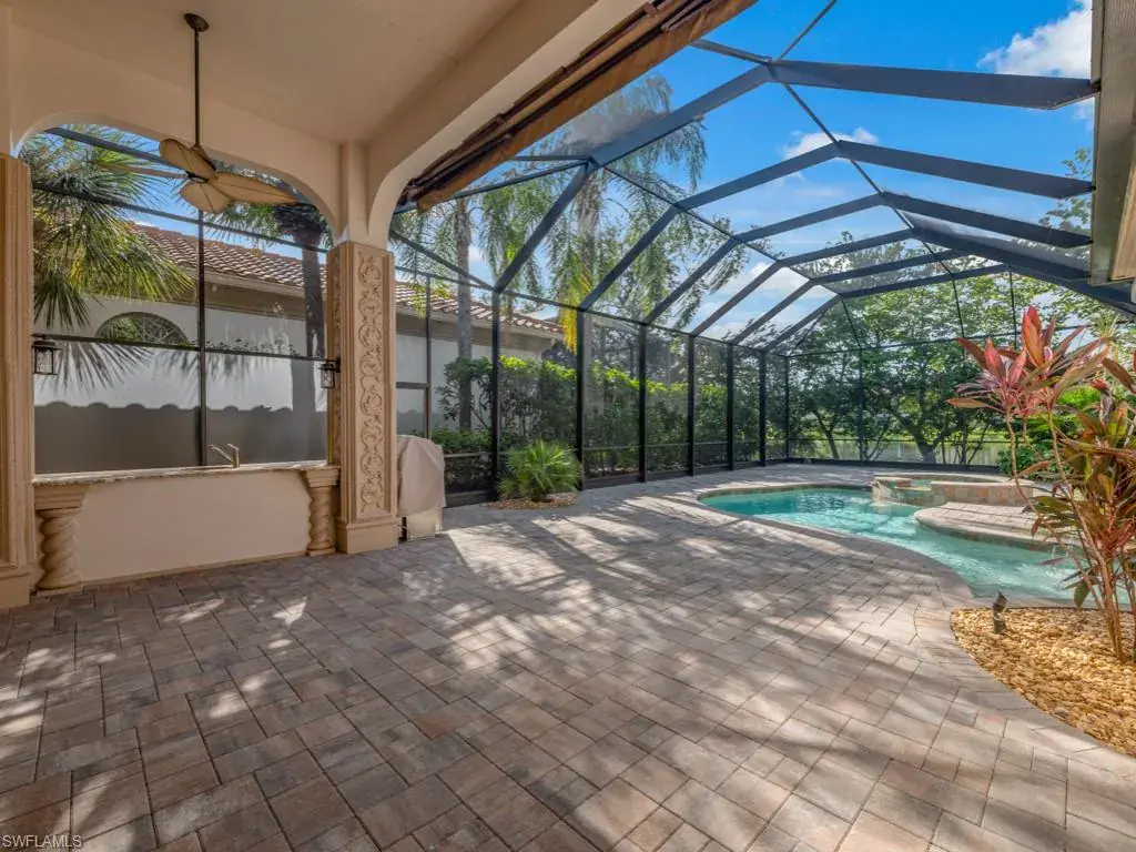 Located in the beautiful Mediterra Golf & Country Club – NEWLY RENOVATED PRIVATE BEACH CLUB – A paradise surrounded by lush tropical landscaping throughout the private courtyard entrance. The living and dining rooms are graced by neutral tile floors accented by 14k gold corner inlays. Sunlight is abundant in the main living area through large sliding doors and arched and transom windows artfully detailed by crown moldings and high ceilings. The kitchen features extra deep, rich wood cabinets, granite, stainless steel appliances, copper backsplash & stainless/copper floor inlay accents. One-of-a-kind decor, 14k gold basins & fixtures, plus onyx countertops in guest/powder bath. Beautiful built-ins from 3rd bedroom/den, walk-in closet & private bath. Expanded screened lanai with covered veranda, free-form pool, spa & regal wall fountain waterfall. The charming summer kitchen doubles as a wet bar and privacy wall with a standing grill included, plus tropical foliage garden areas. Notable upgrades include top-of the-line custom whole home surround sound inside and out, with a full entertainment control system. Additionally, the home has an air conditioned two-car garage with new paint & epoxy flooring in 2024. Garage overhead door opener and remote controls 2024. Smoke and fire alarm system retrofitted in 2024. AC (house) July 2023. AC (garage) April 2023. Samsung kitchen appliances in 2021. Samsung washer/dryer 2022. Roof and pool cage- 2021. Whole House Generator 2017. Mediterra is a prestigious luxury golf & country club community featuring Two championship Tom-Fazio golf courses for avid golfers, a private beach club with restaurant & bar, multiple tennis courts, pickle-ball & bocce, fitness center, pristine bike & jogging trails, and luxurious dining at the private country club restaurant. The Mediterra Beach Club offers an escape to a 10,000 sq. ft two-story private oceanfront paradise on the Gulf of Mexico. Featuring a restaurant & bar that serves members via indoor & outdoor dining, this private facility boasts a heated swimming pool, a sundeck, and cabana beach service for chairs, umbrellas & refreshments.