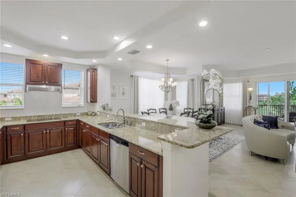Great price improvement at Vista Pointe! Welcome to Vineyards luxury mid-rise, offering the most incredible, maintenance-free lifestyle! Whether looking for a vacation home or a residence that offers year-round relaxation, this beautifully furnished 3-bedroom, 3.5-bath END-UNIT with a private elevator is ready for you. This impressive home features over 2,640 square feet of indoor/outdoor living filled with lots of natural light and two spacious terraces with spectacular golf course greens and sparkling lake views all around. The open-concept layout seamlessly connects a fabulous kitchen to dining and living areas and is perfect for those memorable dinner parties. Additional features include storage area, one deeded garage parking space as well as assigned outdoor parking space, and plentiful guest parking right outside the building. Located in the heart of North Naples, Vineyards community offers many exceptional amenities and a truly vibrant lifestyle. Vineyards residents enjoy two award-winning 18-hole championship golf courses, tastefully remastered Clubhouse, resort-style pool and spa with food and beverage service, state-of-the-art fitness center, spa and wellness center, racquet sports program to include tennis and pickleball, miles of trails for walking and biking, impressive restaurant and bar outlets with unparalleled service, and a fun and exciting social calendar – all within the community. Only minutes away from the world-famous white sand beaches, boating and water activities, art galleries and boutiques, upscale shopping and dining, and so much more.