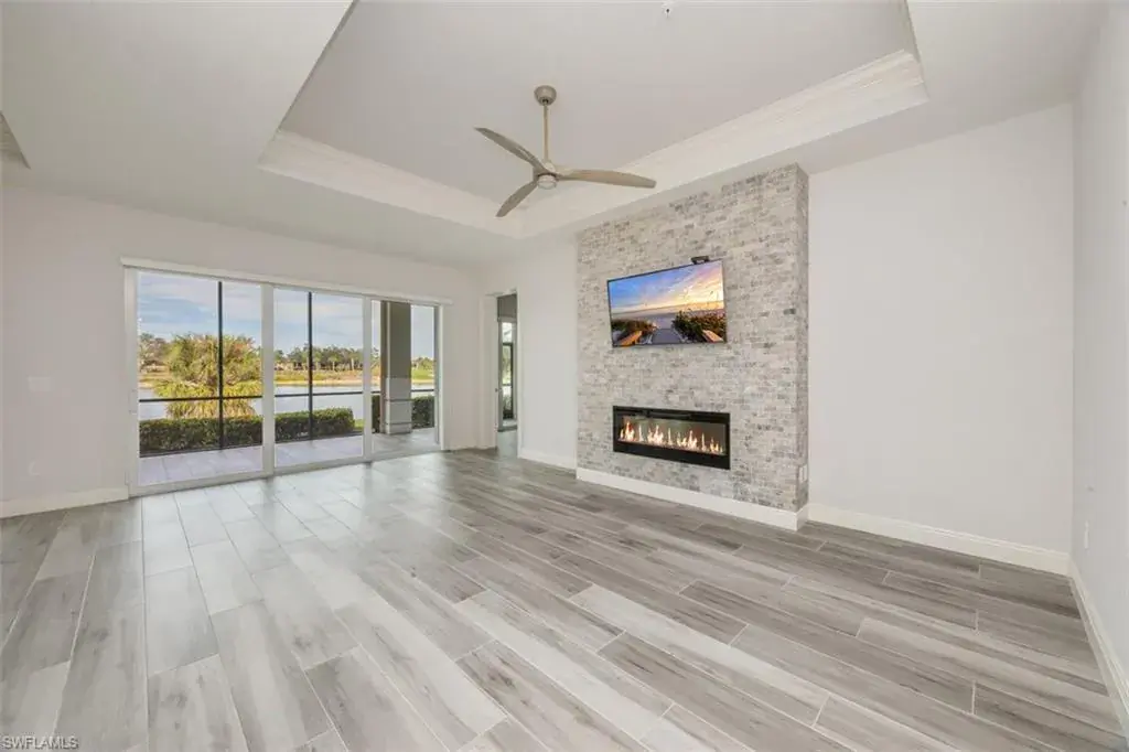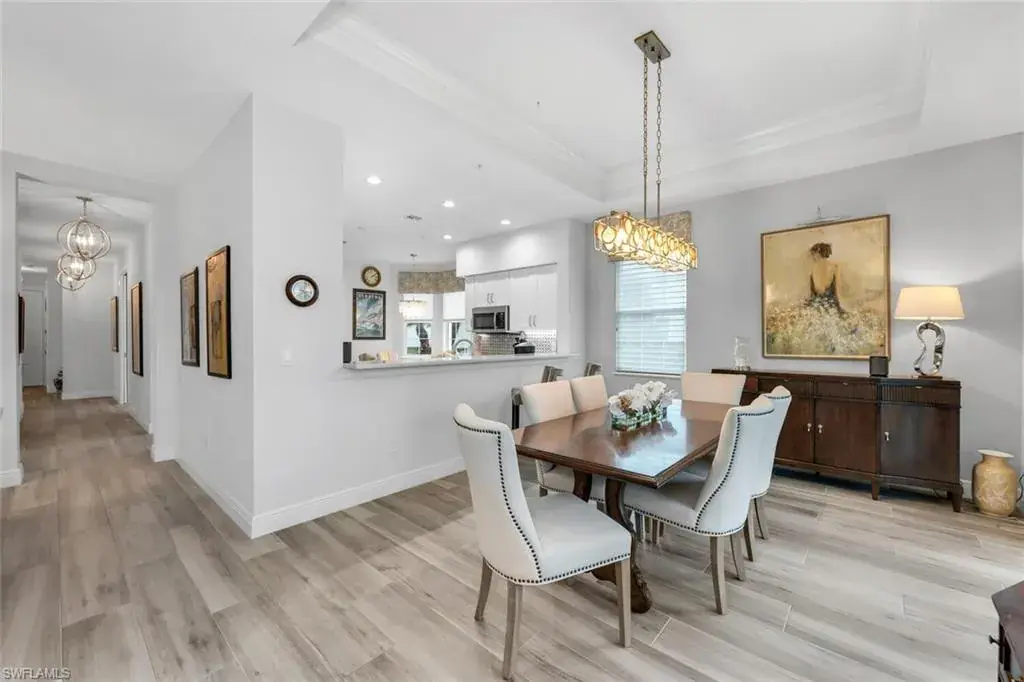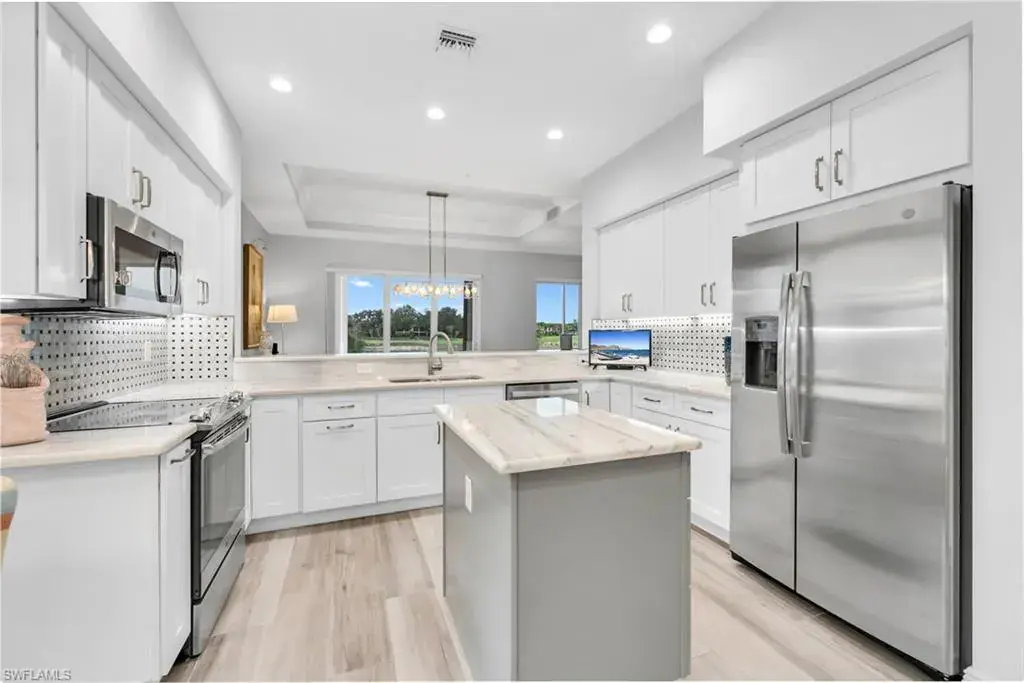 Vista Pointe is an extraordinary, gated community within the Vineyards. This stunning first-floor home has the finest views in the neighborhood. With sweeping vistas of the meticulously maintained golf course, serene lakes, and enchanting fountains, this residence offers a rare blend of natural beauty and refined luxury. Built in 2018, this home combines modern elegance with thoughtful upgrades. Step inside to discover bright and airy living spaces, enhanced by an abundance of natural sunlight streaming through expansive windows. The interior features exquisite tile flooring throughout, exuding both style and durability. The heart of the home, the kitchen, is a masterpiece of design with pristine white granite countertops, sleek cabinetry, and upgraded stainless steel appliances – a chef’s dream come true. The living area is anchored by an electric fireplace set into a beautifully crafted decorative wall, creating a cozy yet sophisticated ambiance. Overhead, silver-upgraded chandeliers add a touch of glamour and elevate the aesthetic of the space, making it perfect for both relaxing evenings and elegant gatherings. With a TWO-car garage, this home offers convenience and practicality, while its new exterior light paint adds modern beauty. Outdoor enthusiasts will appreciate the seamless connection between indoor and outdoor living, with views that perfectly frame the natural splendor of the community. This Vista Point gem is more than a home – it is a lifestyle.