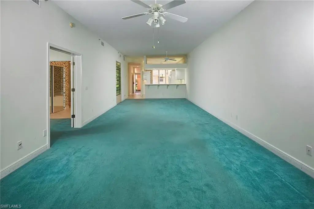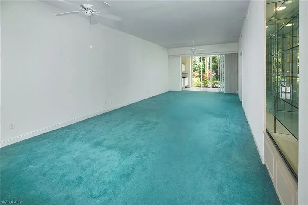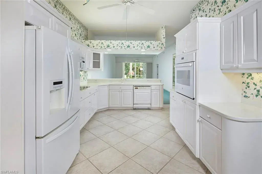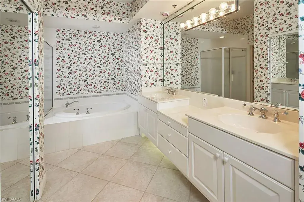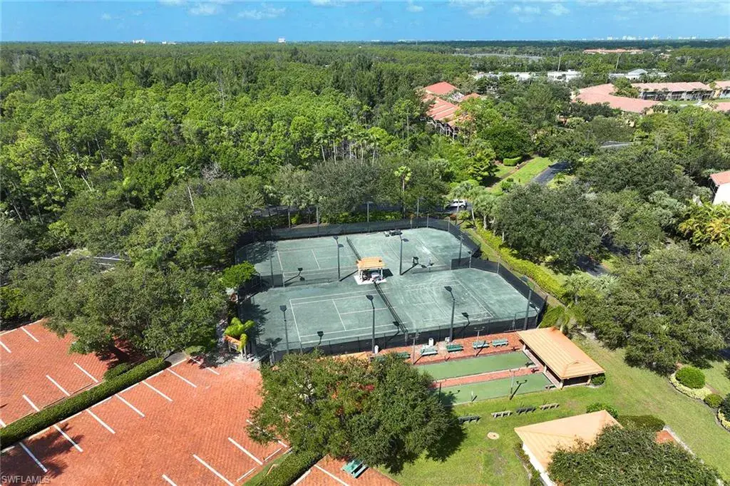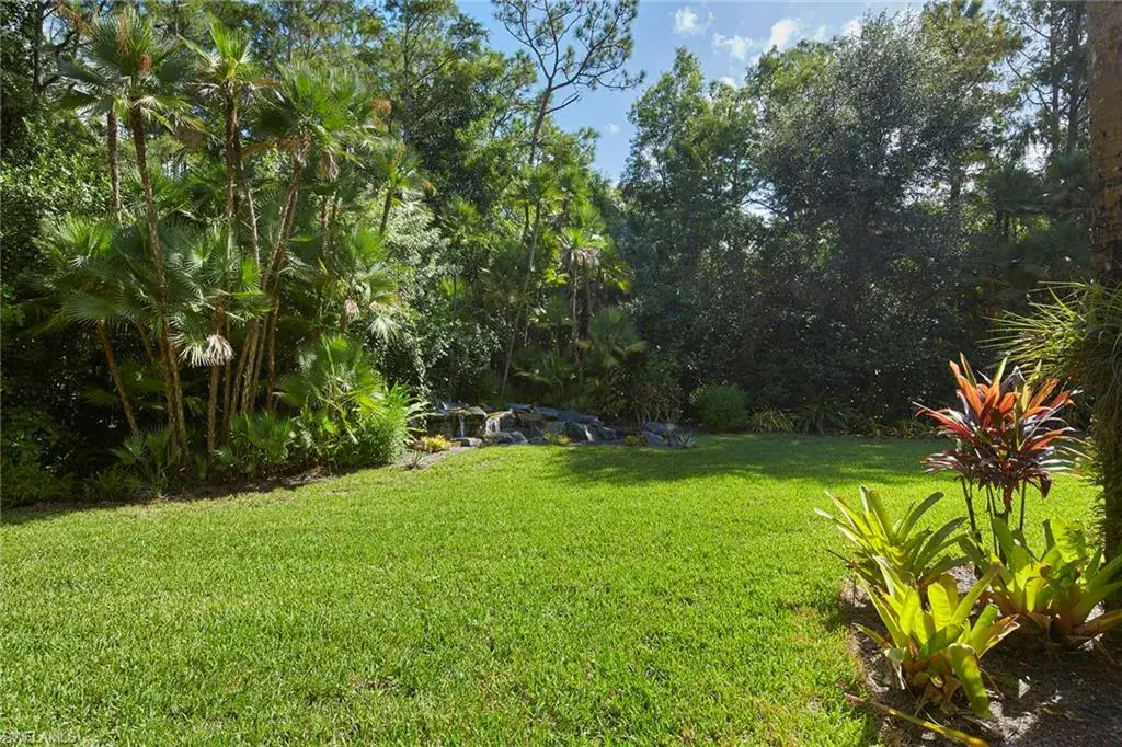 This spacious two-bedroom, two-bath first-floor residence is conveniently a short distance to the clubhouse, community pool and entertaining area. Featuring an open living concept with 10-foot ceilings, a 14-by-32-foot great room and split bedroom floor plan to ensure privacy. Sliding glass doors 9 feet wide open onto the 11-by-30-foot screened lanai with outdoor kitchen and private, wooded and tropical landscaped setting with a bubbling rock waterfall. The kitchen has many sunny windows in the eating area and offers under-cabinet lighting, custom pullouts, a pantry and breakfast bar. Primary bedroom has a tray ceiling, French doors opening to the lanai, bath area featuring large walk-in closet with wood shelving, double vanities, walk-in shower, jetted tub and separate water closet area. Laundry room has full-size washer and dryer, cabinets, shelving and laundry tub. Air conditioner and water heater were replaced 9/2025. Electric shutters plus a detached one-car garage. This amenity-rich development offers tennis, bocce ball, putting green, shuffleboard, clubhouse with kitchen and one of the largest outdoor swimming pools in Southwest Florida (11,000 square feet) with waterfall. Just minutes from shopping, restaurants, medical facilities, the 5h Avenue South/3rd Street district, and beautiful Gulf beaches.