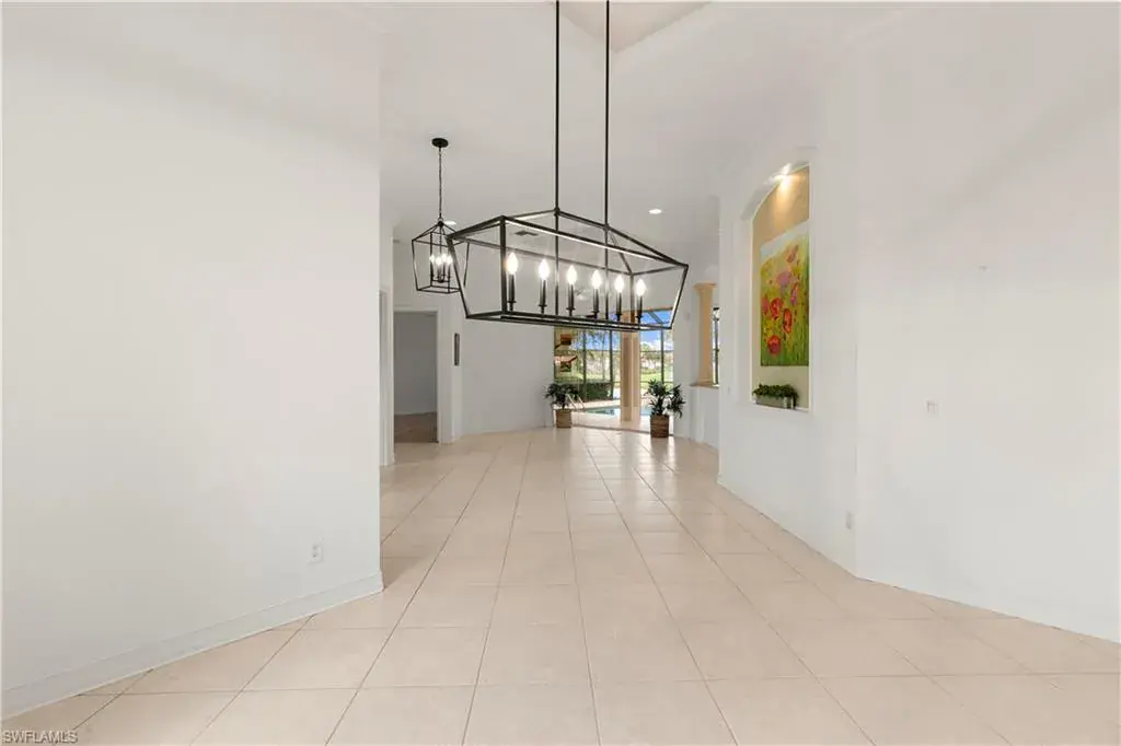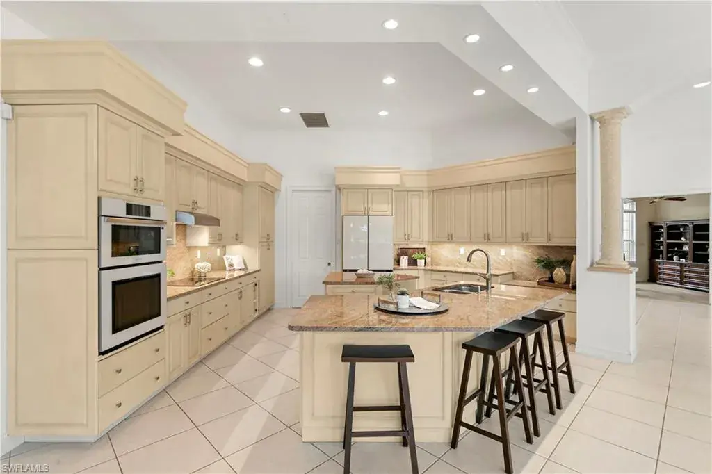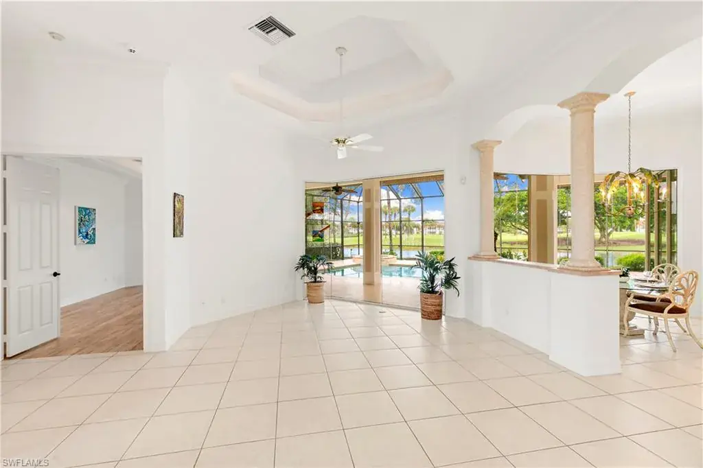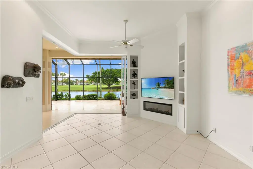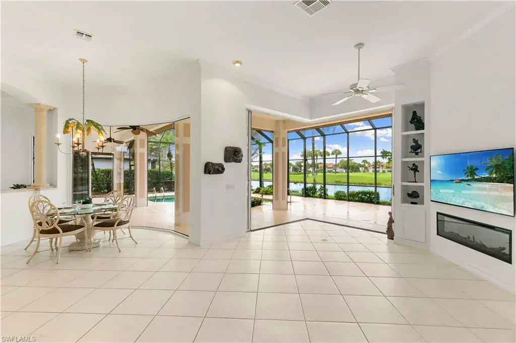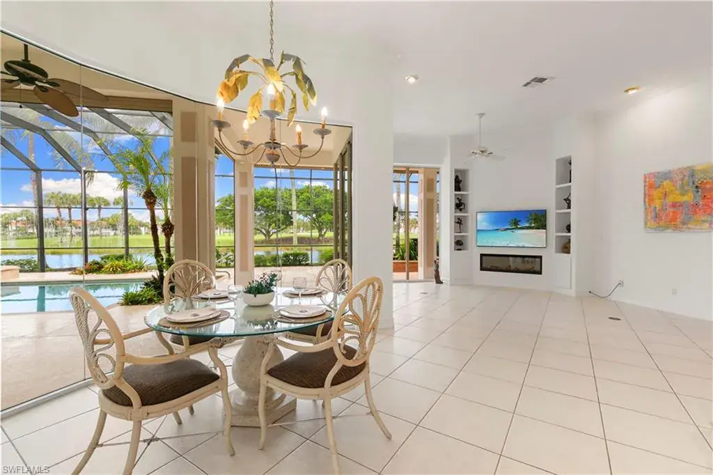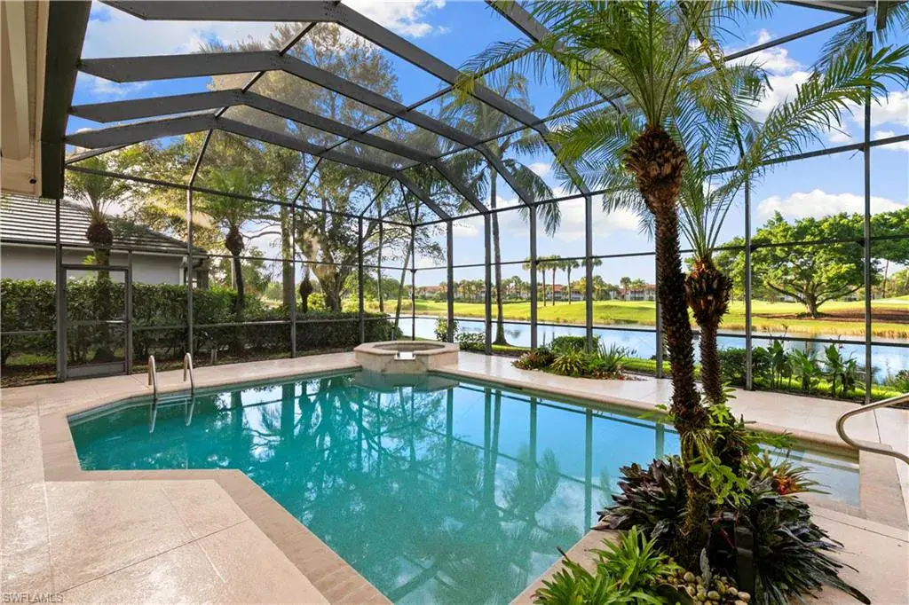 Discover resort-style living in this beautifully appointed single family home featuring three bedrooms plus a den/office and three bathrooms, perfectly situated in the highly sought-after gated community of Watercrest at Pelican Marsh. Step inside to an open-concept floor plan with a spacious kitchen featuring a center island, perfect for entertaining. The bright living spaces flow seamlessly to the serene screened lanai, where a sparkling swimming pool overlooks breathtaking water and golf course views—an ideal setting for relaxing with a morning coffee or for hosting sunset gatherings with guests. The private owner’s suite offers serene views and a spa-like bath with access to the screened lanai and pool area. Additional features include a whole house generator, 42” cabinets in the kitchen, crown molding and 8’ doors throughout the interior of the home. Pelican Marsh is one of Naples’ premier golf course communities, offering an array of amenities including tennis, fitness, walking and biking paths and optional private golf membership. Enjoy the perfect combination of privacy, luxury, and convenience, just minutes from white-sand beaches, Mercato, and world-class dining and shopping.
