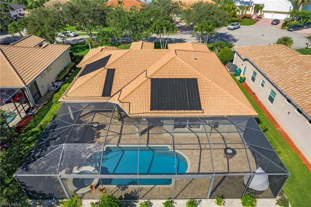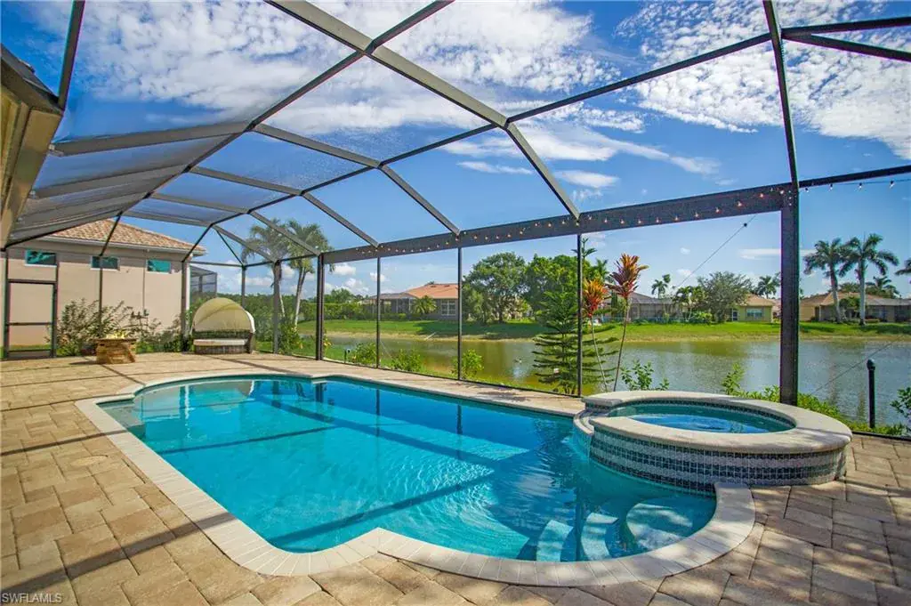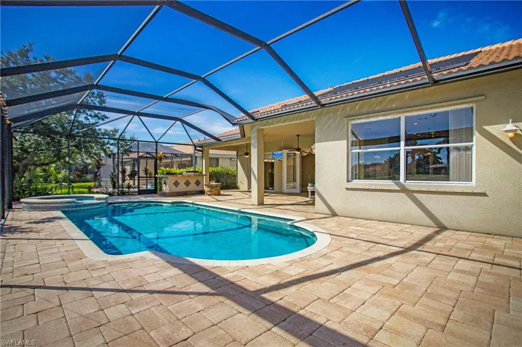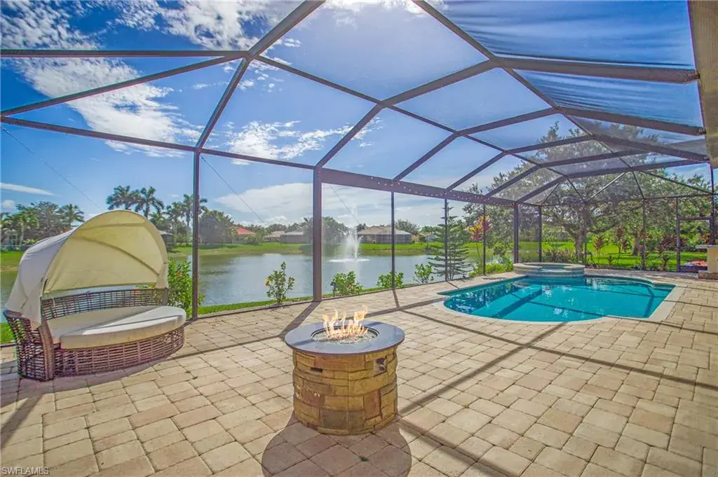 Your search just might be over when you see this spacious 4 Bedroom+Home Office/Den, Pool and Spa home! This Dover floor plan gives your family and your guests lots of privacy. Working from home is a pleasure with a large home office/den. This home offers a separate dining room, eat-in area in kitchen + 2 living areas that lead to the pool area and provide lots of natural light and a gorgeous lake/fountain view. The owner’s suite has a custom stained glass transom window and sliding glass doors that lead to the pool/spa area. Custom shelves in walk-in closets. Outdoor living is enjoyable with an extended screened pool area, outdoor kitchen, 2 propane fire fits, plus you will enjoy having some outdoor space under roof where you see a mounted TV and plenty of room for your outdoor furniture. A great home for entertaining and for enjoying quality family time. The property has 1/4 ac. lot & is located at cul-de-sac with no thru-traffic. Mature landscaping, high ceilings, lots of storage, brick paver driveway/pool area, low fees + future community growth add to the appeal! Boat/RV storage available w/i community for a nominal fee. New roof 2019;A/C 2020;Pool/Spa/Enclosure added in 2014.