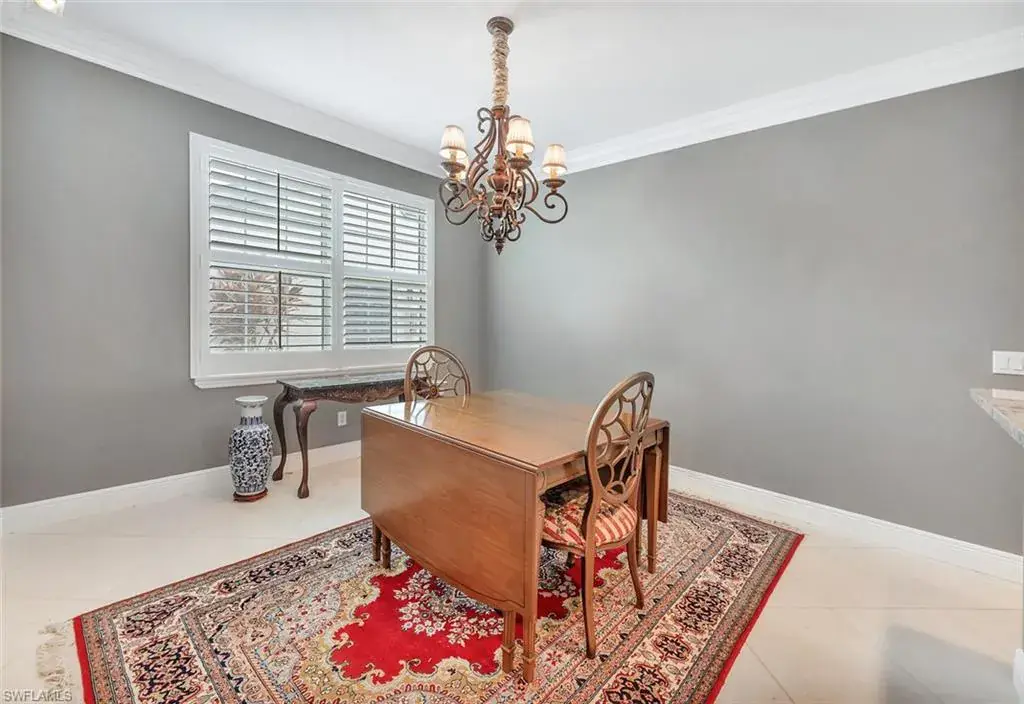 Interior highlights include granite countertops, stainless appliances, crown molding, plantation shutters, and tile flooring laid on the diagonal. The versatile den can easily function as a home office, dining area, or additional guest space.