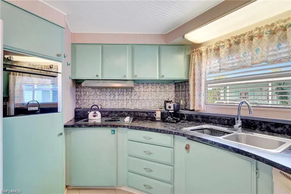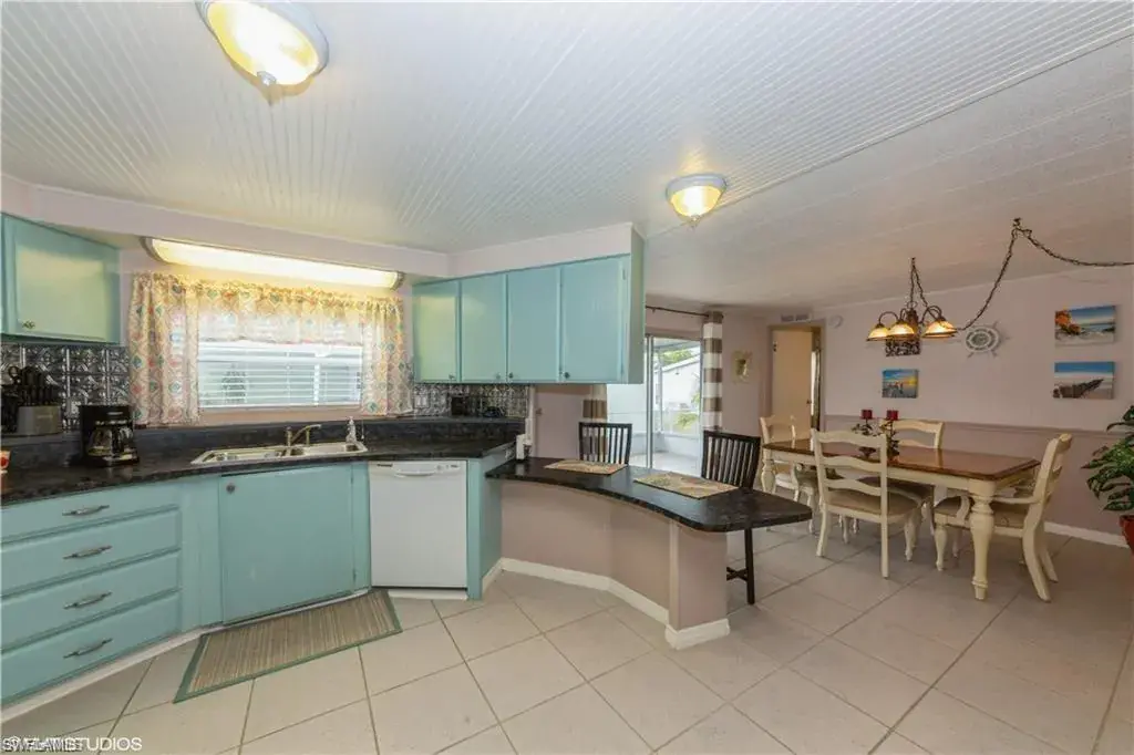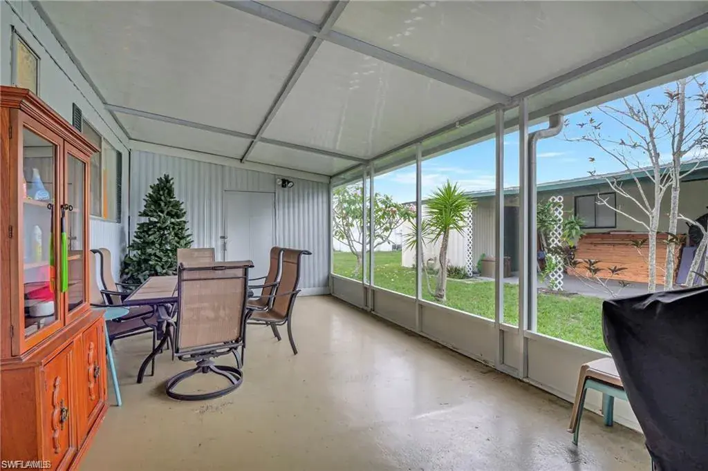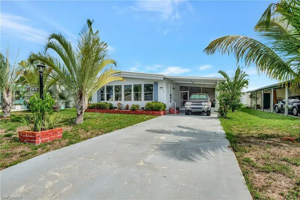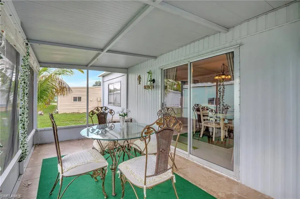 An adorable manufactured home with two screened-in lanais, one with a double door (ground level) for easy access where you store your golf cart in the secured storage. Large sunny family room windows along the front of the home that shares the space with an eat-in area & built-ins. Friendly, small 55+ community with low fees & you own the land! The kitchen sits in the heart of the home, adjacent to a 2 seater breakfast bar & dining area. 1 of the 2 lanai is west facing & directly off the dining room, perfect for your morning coffee. Turnkey furnished (exclude massage chair in family room & master bedroom mattress). Primary bedroom has 2 closets & walk-in shower while the guest quarters share an efficient hall bath with 2 entrances. Compact office space has a built in desk & an abundance of storage. The tandem spaced carport provides for ample parking, the second east facing screened-in lanai, & the locked storage with washer/dryer while still having room for the toys. Seasonal use home for the past several years with upgrades including; HVAC, AMS roll over roof with lifetime warranty & the circuit breaker panel all replaced in 2017; washer & dryer, both toilets, UV film on family room (front) windows, & smoke alarms replaced in 2023. 2025 main living room & guest quarters; new 3/4″ sub-flooring & faced fiberglass R-30 insulation.