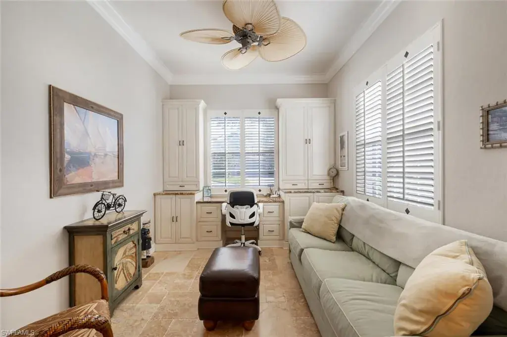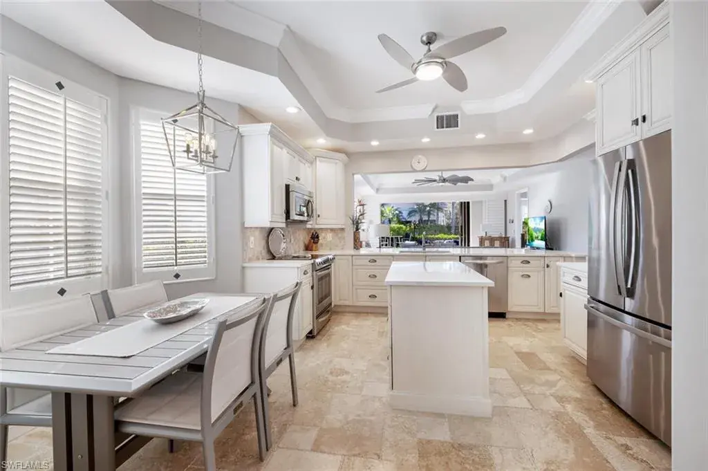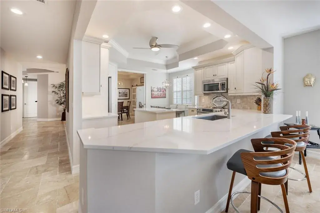 A Beautifully transformed, well maintained coach home in Westchester at Kensington. This home offers the perfect blend of contemporary design and timeless comfort, with no detail overlooked and has a FULL GOLF MEMBERSHIP AVAILABLE TO TRANSFER – NO WAITLIST FOR THE NEW BUYERS! Walls were removed in the entryway, dining area, and kitchen, creating a seamless connection throughout the open living spaces. Fresh neutral paint throughout enhances the timeless appeal, while plantation shutters, updated light fixtures, and ceiling fans provide a polished finish. The well designed eat-in kitchen has a modern yet elegant style, with quartz countertops ,backsplash and Stainless Steel Appliances. Its airy, open design makes it a central hub for entertaining. Elegant glass barn doors add a stylish touch to the dedicated office/den, creating a functional and inviting workspace. The master bathroom has been partially renovated and the guest bathroom has been fully renovated to reflect modern luxury . The primary suite showcases new cabinetry, countertops, sinks, and fixtures, while the guest bath features a new vanity, countertops , sink, floors, and shower. Additional cabinetry was added in the laundry room for extra storage. Family or company alike will enjoy the guest wing, complete with a generous-sized bedroom and a bathroom for optimal comfort and privacy. The outdoor spaces are equally impressive, with a newly screened lanai offering panoramic views and a power retractable sunshade system for year-round enjoyment. Sliding Plantation shutters at the patio entrance add convenience and style. Westchester offers its own community clubhouse, pool, and spa. Don’t miss your opportunity to call this stunning property in Kensington your own!