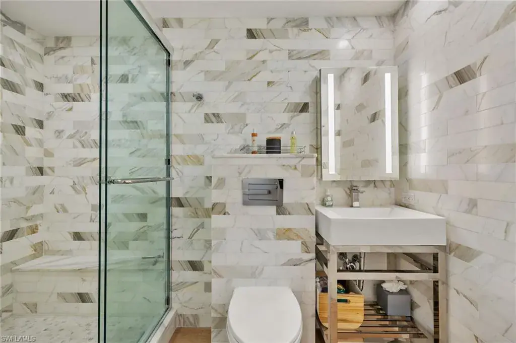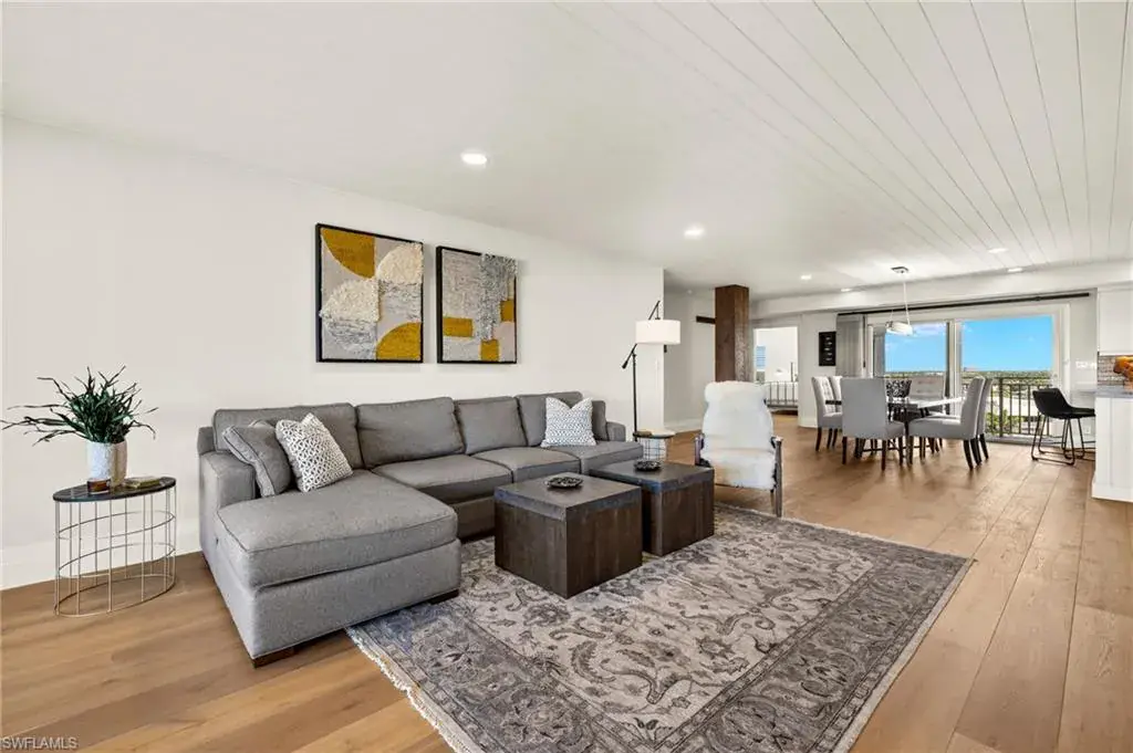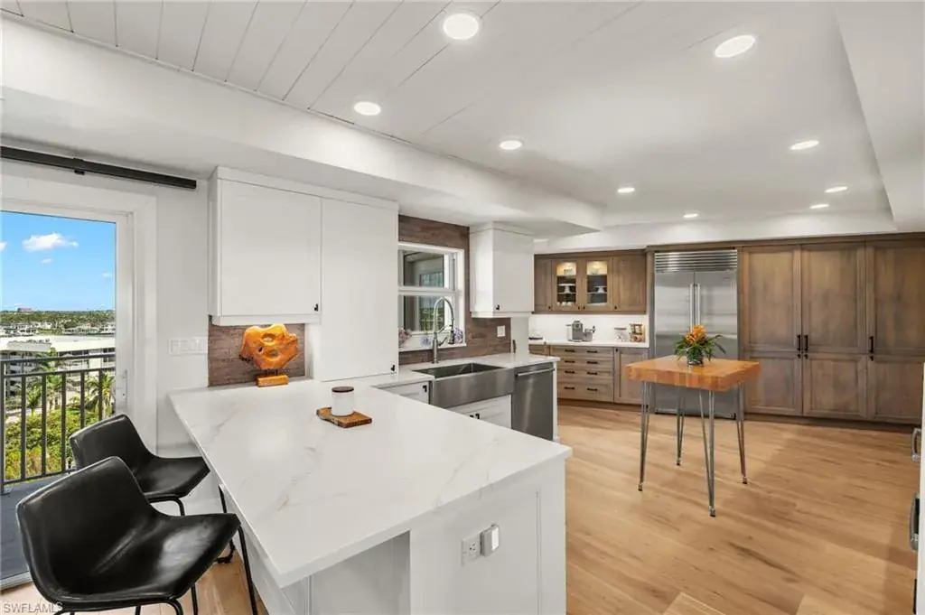 Welcome to Westgate – This penthouse end unit boasts stunning gulf and bay views to enjoy both sunrise and sunsets. This 3 Bedroom/3.5 Bathroom unit in over 2800 square feet of casually elegant living space has been thoughtfully redesigned and recreated ideal for today’s modern living. This fully custom renovation is brought to you by renowned Borelli Construction of Naples. Enter into a welcoming foyer which opens to a fabulous open-concept living space redesigned in order to capture the expansive gulf and bay views. Gorgeous light oak wide plank hardwood floors imported from Italy, reclaimed barn wood columns and doors. Spacious living/dining rooms with wet bar ideal for entertaining. A true chef’s eat-in kitchen replete with custom shaker cabinetry, Sub-Zero refrigerator, Sub-Zero column wine refrigerator, ice maker, Bosch cooktop, oven and dishwasher, honed quartz countertops and breakfast bar. Master suite oasis with spacious bedroom with gulf views and access to lanai, walk-in closet with custom built-ins and a spa-like bathroom including oversized walk-in shower, double vanity and tranquil gulf view. 2 Brand new Air Conditioners!