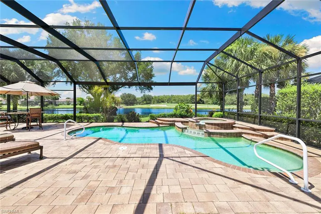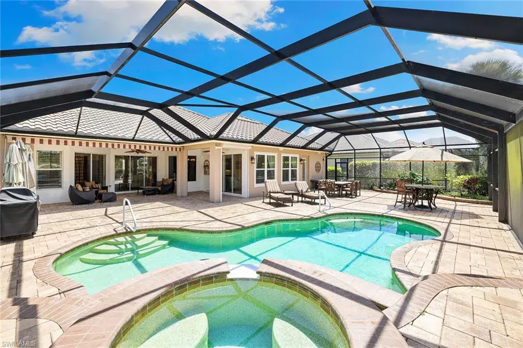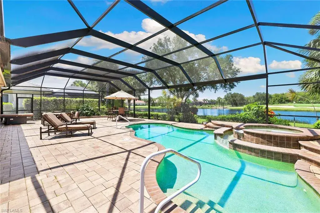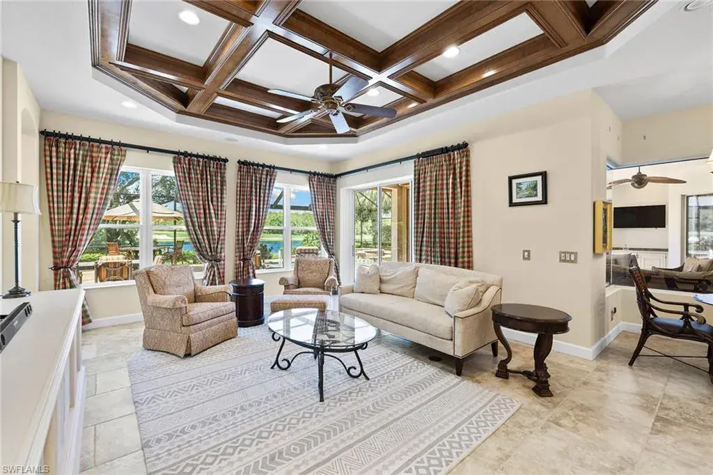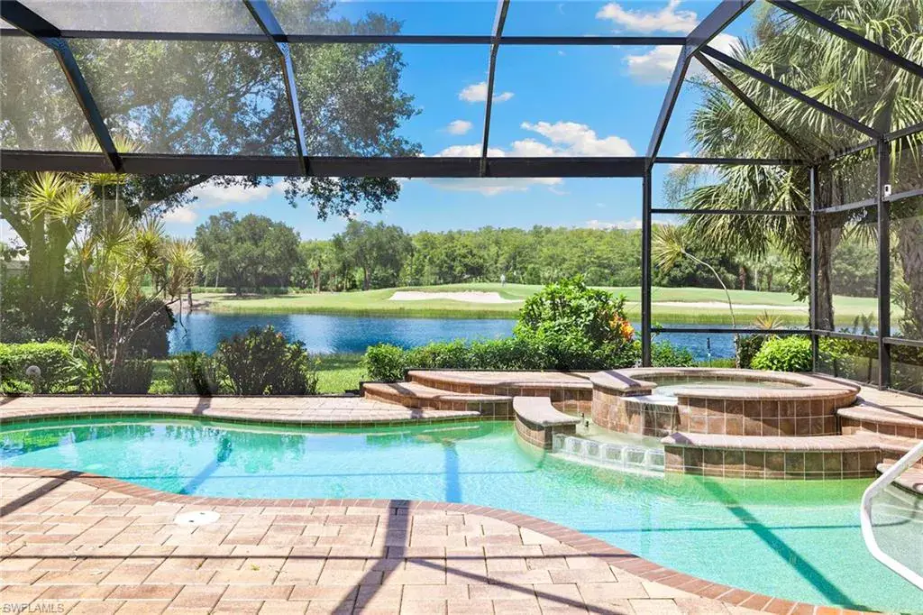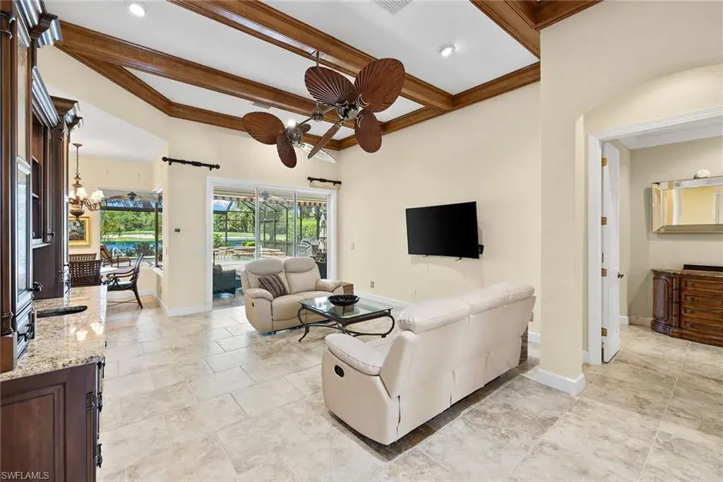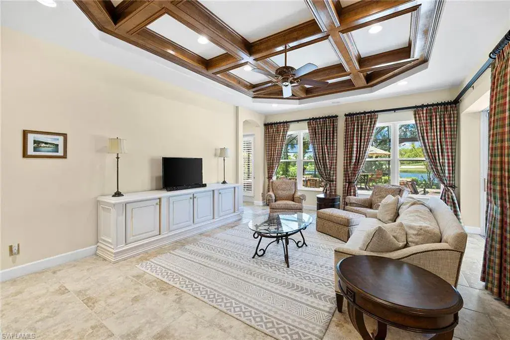 In The TwinEagles Club, a gated golf community offering 36 holes of championship golf, this residence conveys a full golf membership deeded to the property with no waitlist. The four-bedroom plus den, four-bath design spans 3,211 square feet and enjoys southwestern exposure for maximum sunshine on the pool and spa along with breathtaking sunsets. Sweeping lake, golf course and preserve views with no homes across the fairway provide exceptional privacy. The open kitchen offers an island, pantry and abundant cabinetry flowing into the family room, while formal living and dining spaces are ideal for gatherings. The primary suite features lanai access, dual walk-in closets and a spacious bath. Notable upgrades include custom built-ins, intricate coffered ceilings, and electric hurricane shutters on the lanai and front entry. A three-car garage completes this Naples property with access to golf, tennis, fitness and dining.