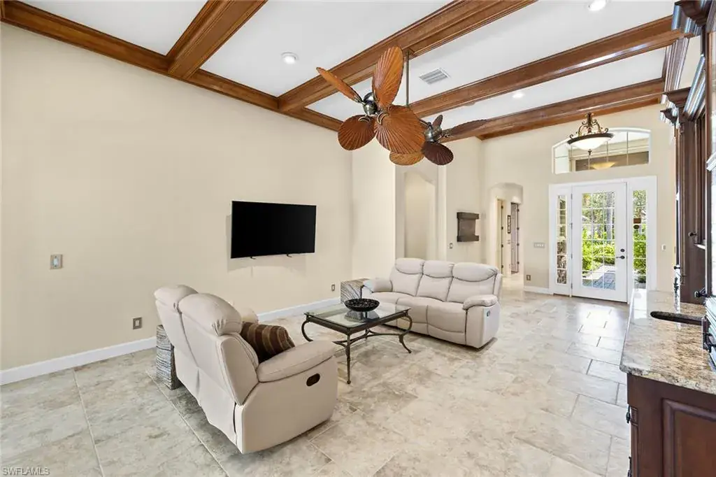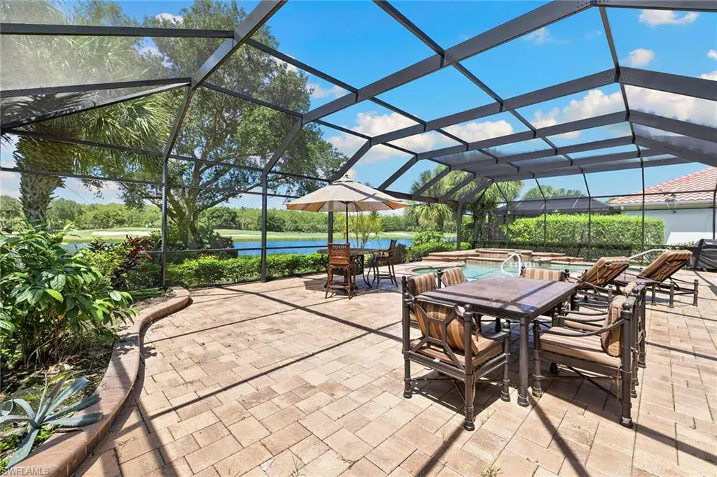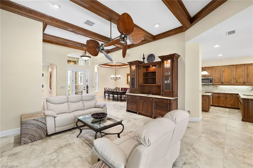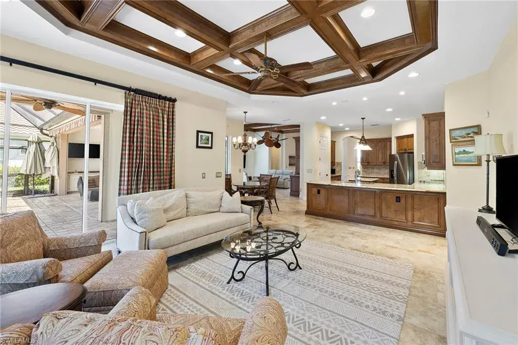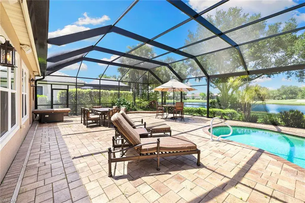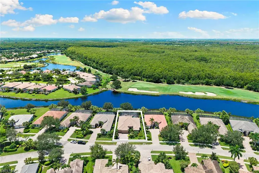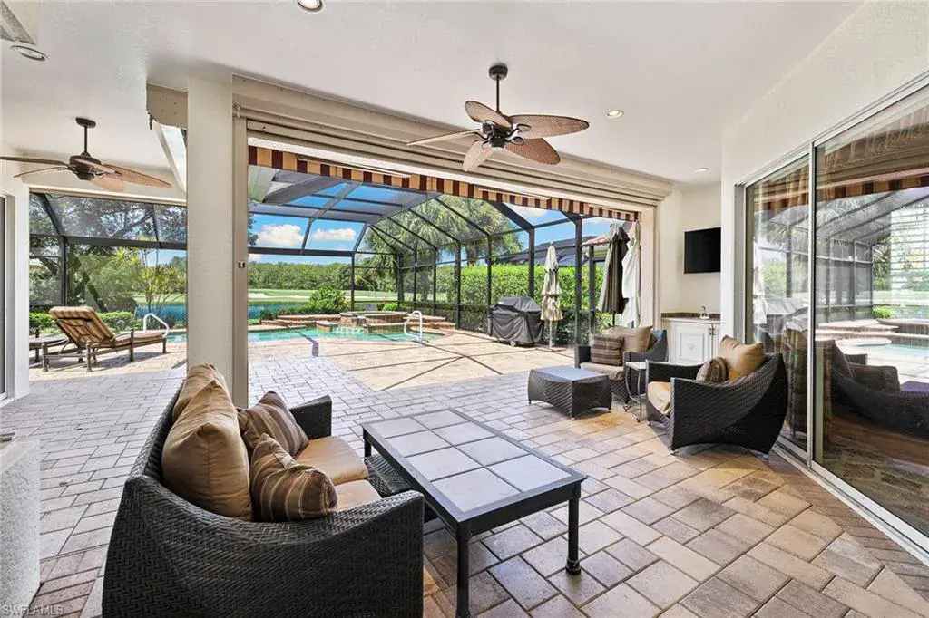 In The TwinEagles Club, a gated golf community offering 36 holes of championship golf, this residence conveys a full golf membership deeded to the property with no waitlist. The four-bedroom plus den, four-bath design spans 3,211 square feet and enjoys southwestern exposure for maximum sunshine on the pool and spa along with breathtaking sunsets. Sweeping lake, golf course and preserve views with no homes across the fairway provide exceptional privacy. The open kitchen offers an island, pantry and abundant cabinetry flowing into the family room, while formal living and dining spaces are ideal for gatherings. The primary suite features lanai access, dual walk-in closets and a spacious bath. Notable upgrades include custom built-ins, intricate coffered ceilings, and electric hurricane shutters on the lanai and front entry. A three-car garage completes this Naples property with access to golf, tennis, fitness and dining.