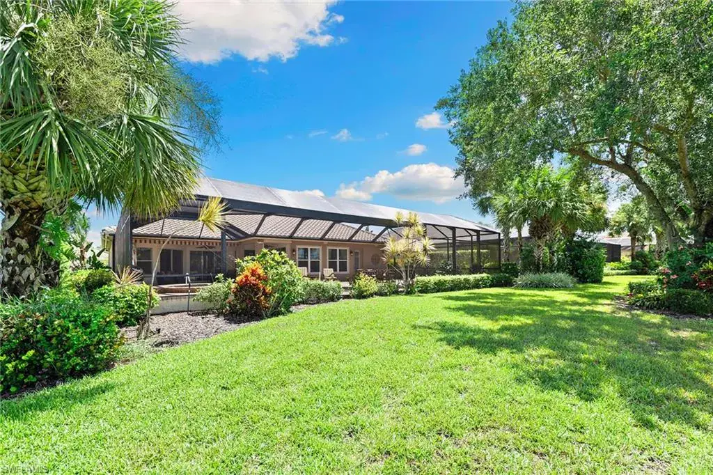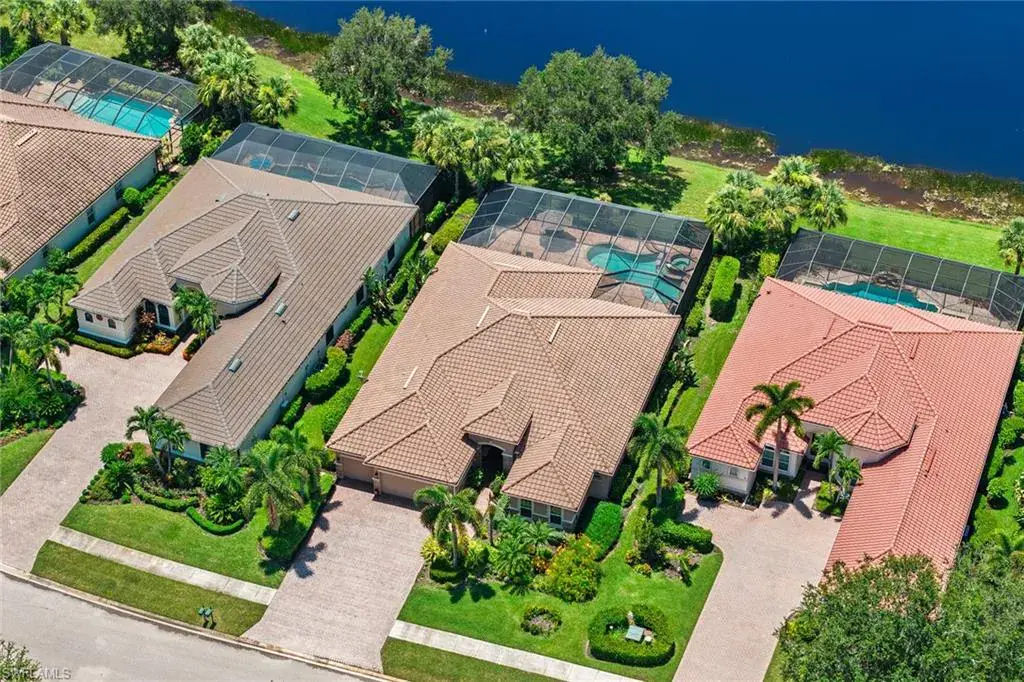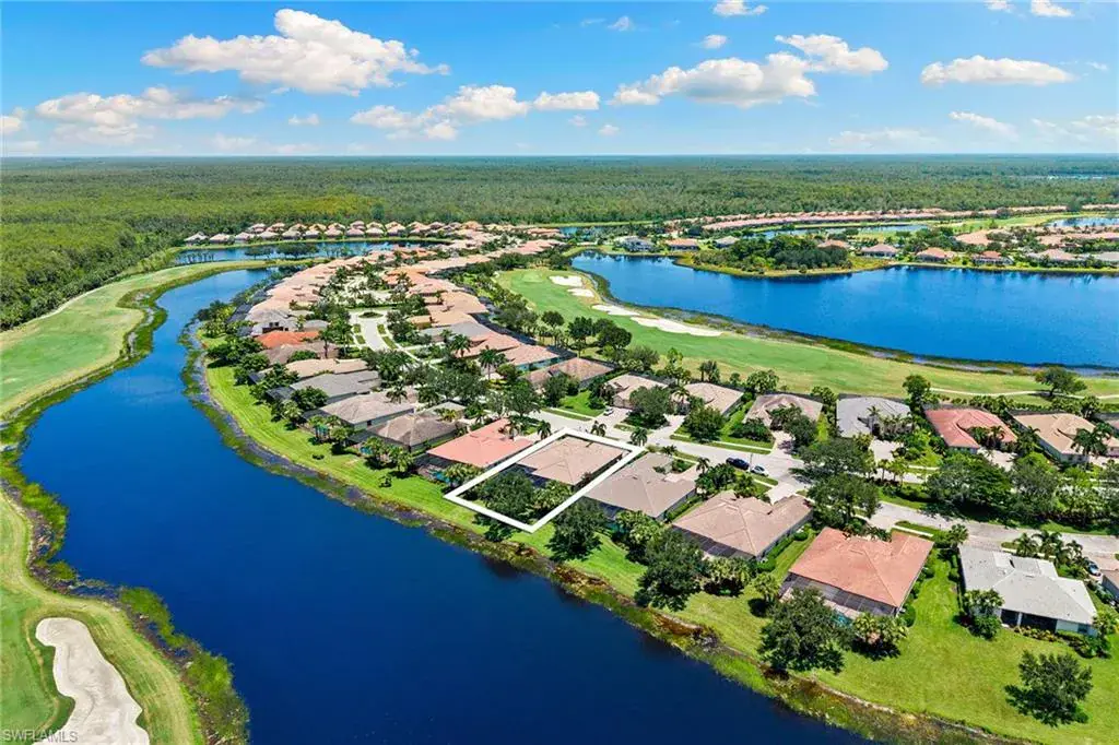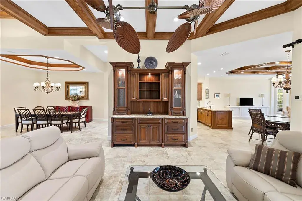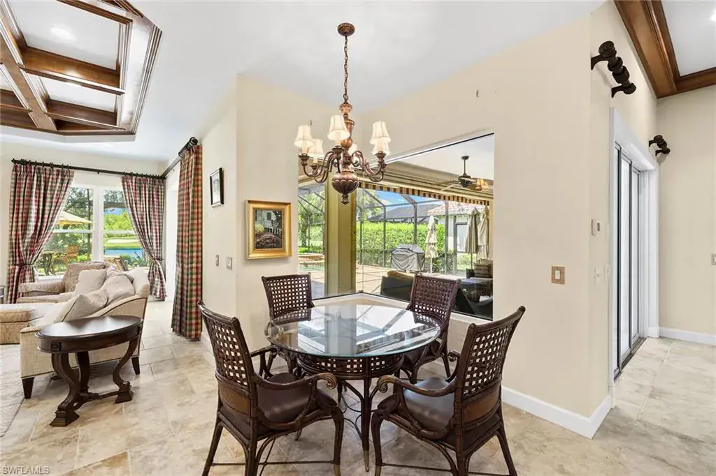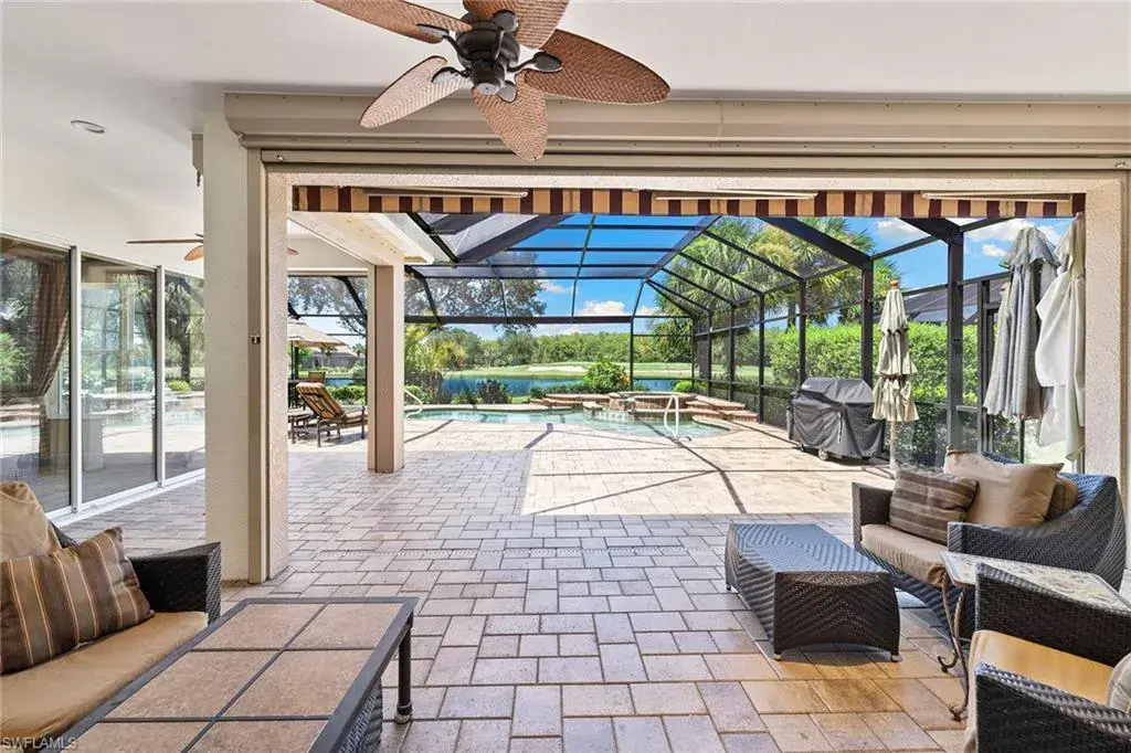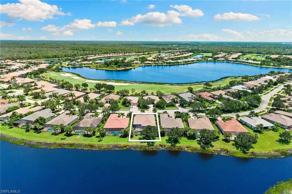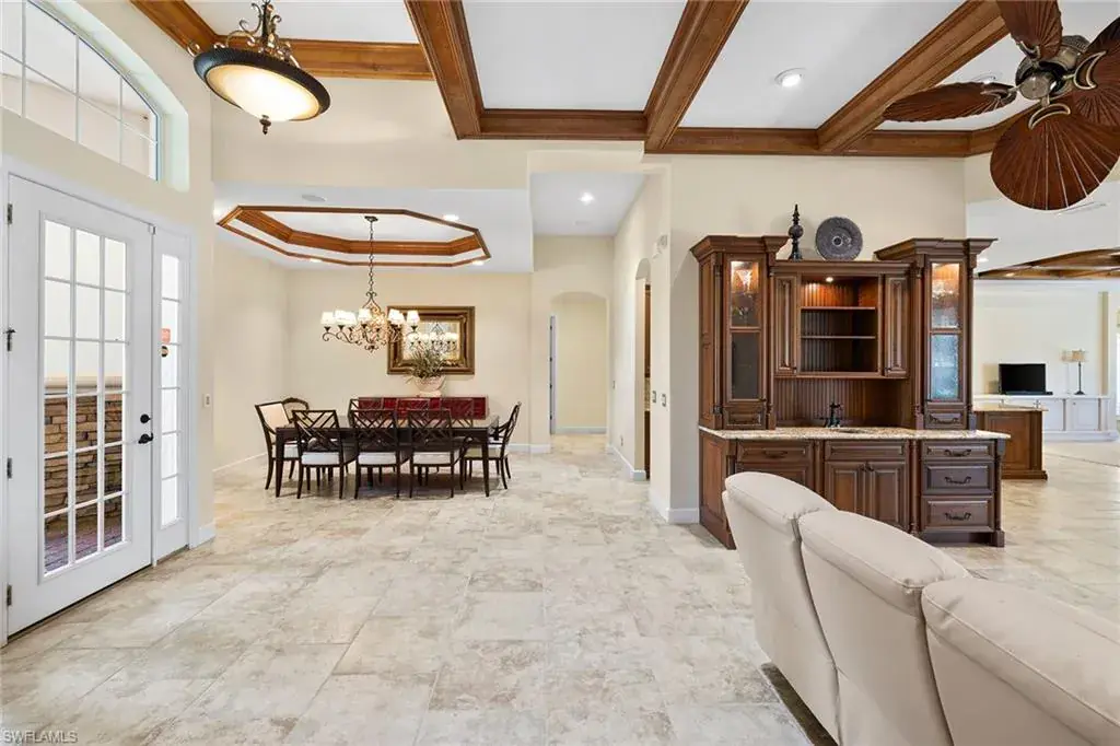 In The TwinEagles Club, a gated golf community offering 36 holes of championship golf, this residence conveys a full golf membership deeded to the property with no waitlist. The four-bedroom plus den, four-bath design spans 3,211 square feet and enjoys southwestern exposure for maximum sunshine on the pool and spa along with breathtaking sunsets. Sweeping lake, golf course and preserve views with no homes across the fairway provide exceptional privacy. The open kitchen offers an island, pantry and abundant cabinetry flowing into the family room, while formal living and dining spaces are ideal for gatherings. The primary suite features lanai access, dual walk-in closets and a spacious bath. Notable upgrades include custom built-ins, intricate coffered ceilings, and electric hurricane shutters on the lanai and front entry. A three-car garage completes this Naples property with access to golf, tennis, fitness and dining.