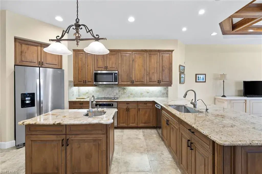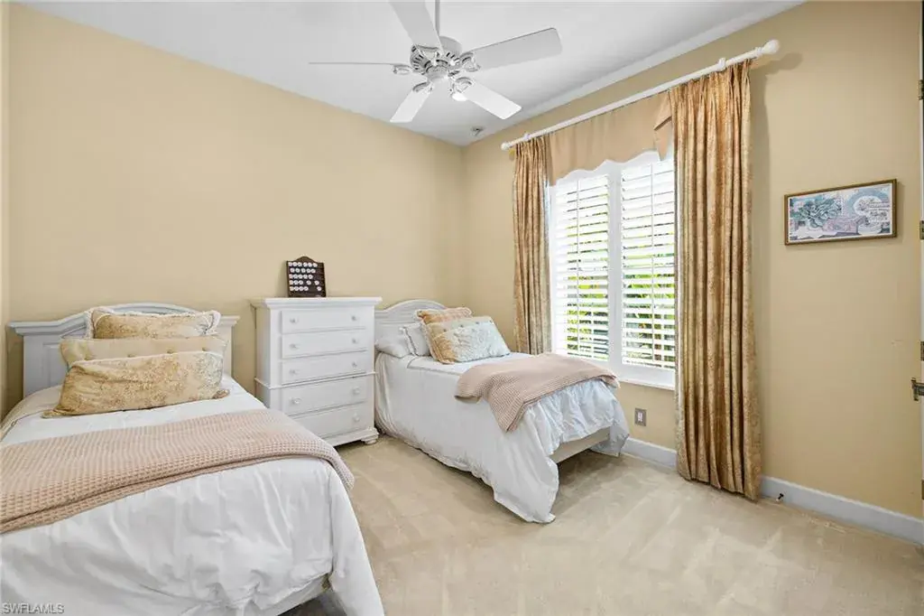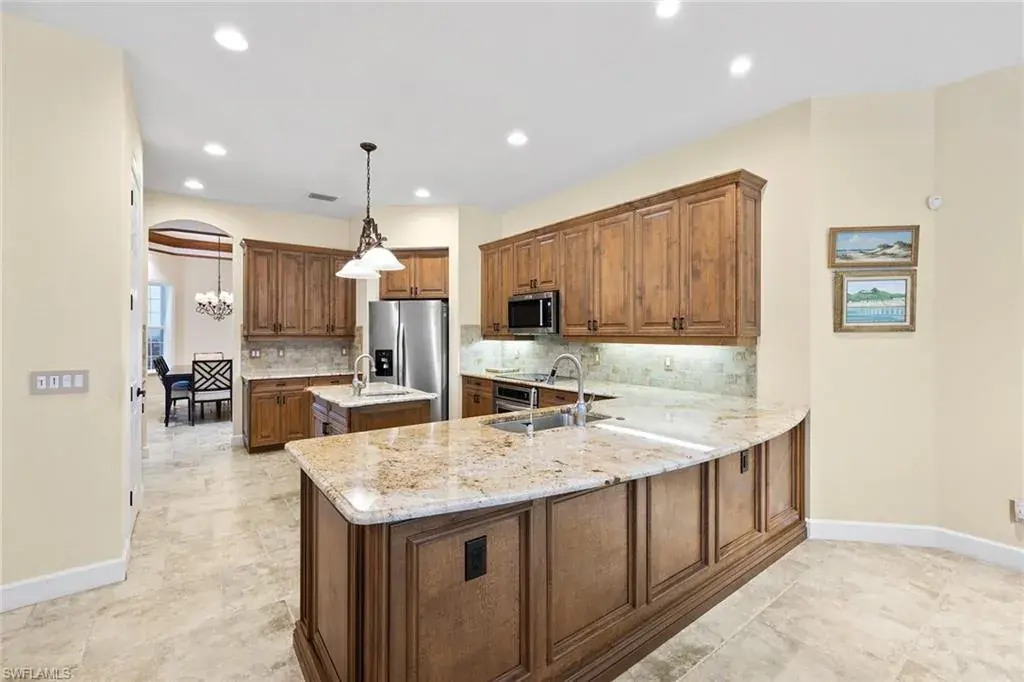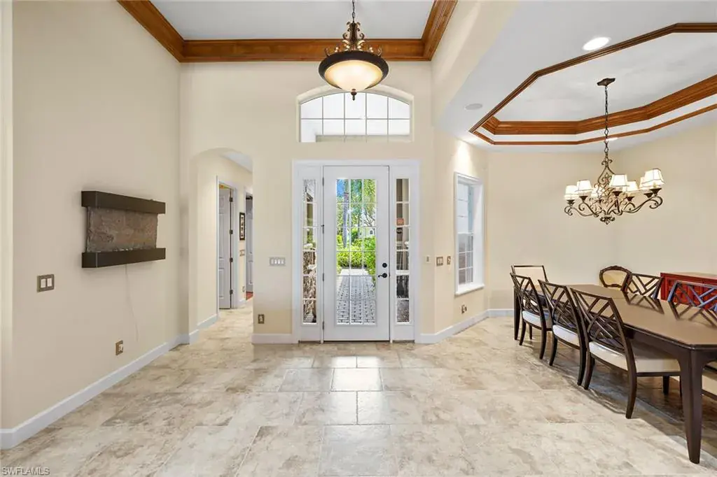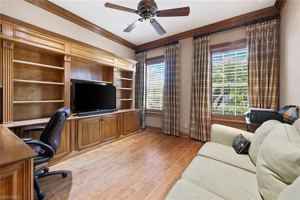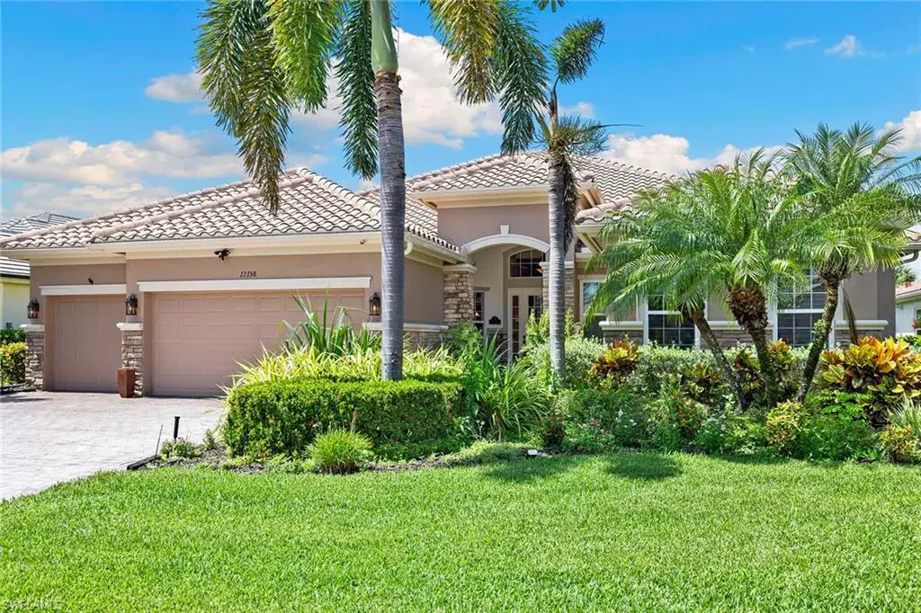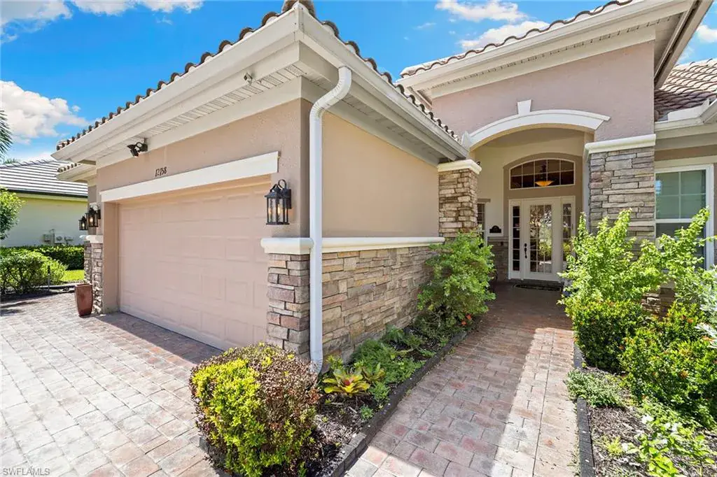 In The TwinEagles Club, a gated golf community offering 36 holes of championship golf, this residence conveys a full golf membership deeded to the property with no waitlist. The four-bedroom plus den, four-bath design spans 3,211 square feet and enjoys southwestern exposure for maximum sunshine on the pool and spa along with breathtaking sunsets. Sweeping lake, golf course and preserve views with no homes across the fairway provide exceptional privacy. The open kitchen offers an island, pantry and abundant cabinetry flowing into the family room, while formal living and dining spaces are ideal for gatherings. The primary suite features lanai access, dual walk-in closets and a spacious bath. Notable upgrades include custom built-ins, intricate coffered ceilings, and electric hurricane shutters on the lanai and front entry. A three-car garage completes this Naples property with access to golf, tennis, fitness and dining.