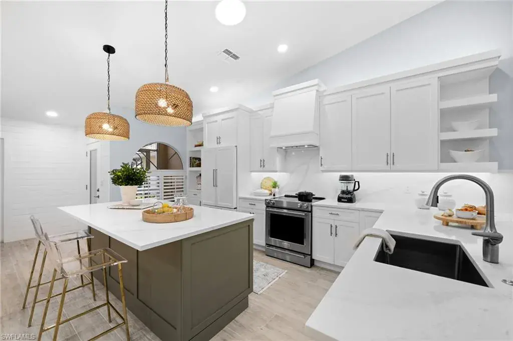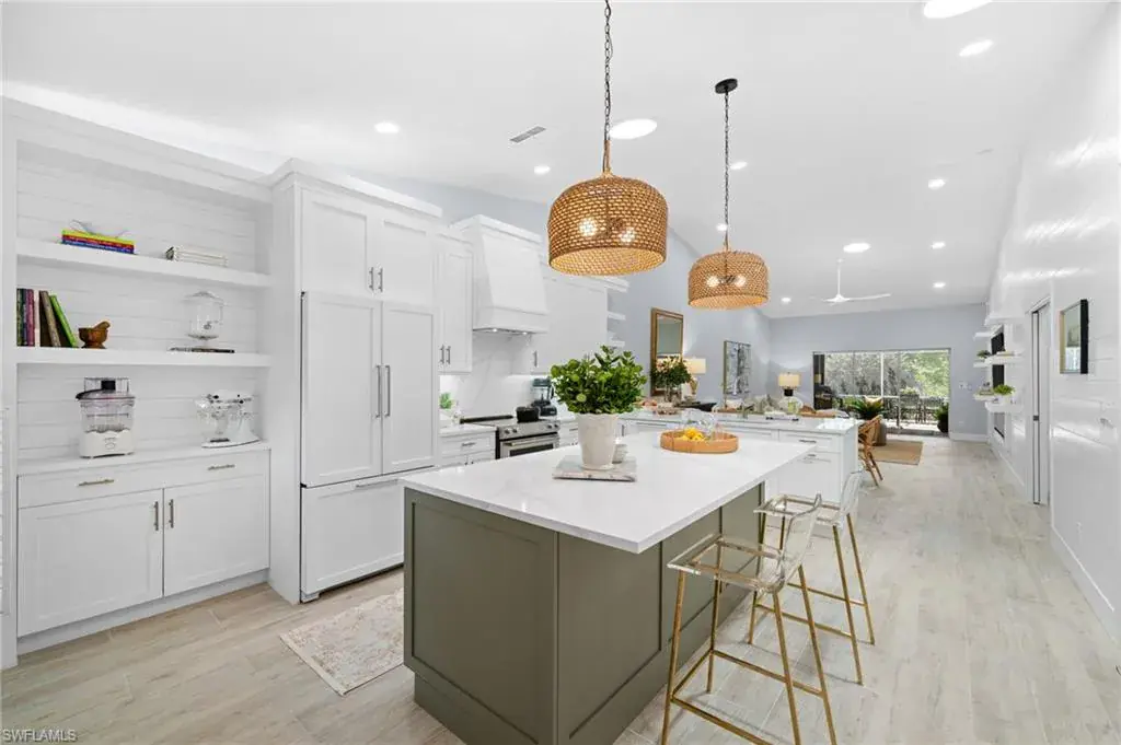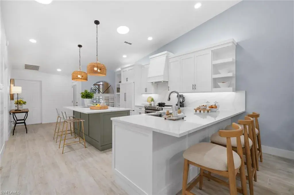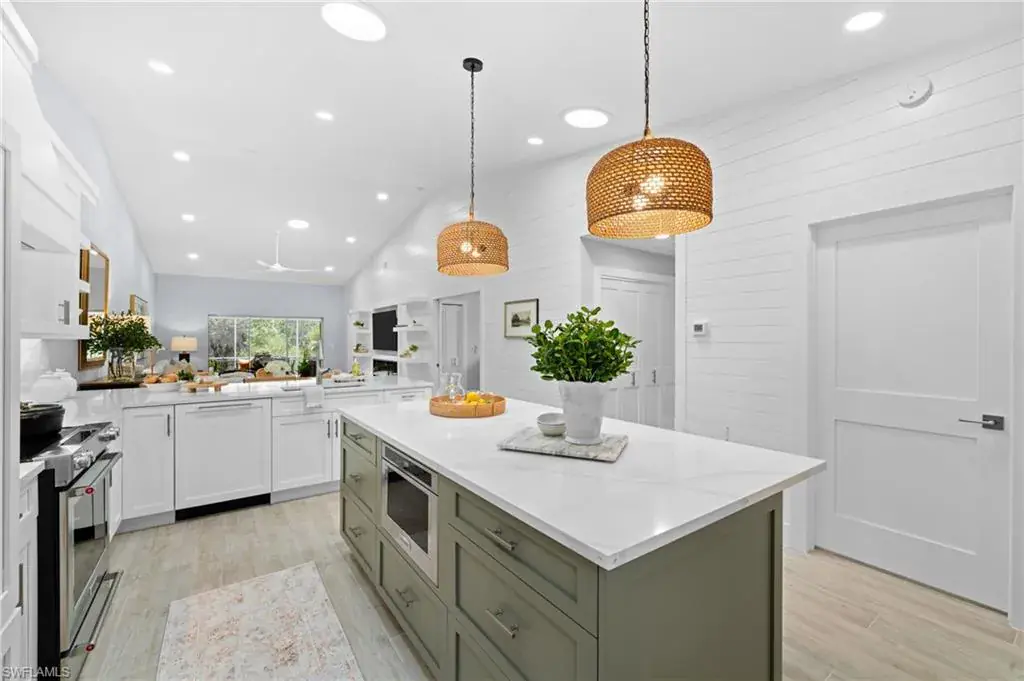 Completely renovated and turnkey furnished coastal villa west of US 41! This fully updated coastal contemporary villa offers unparalleled luxury and convenience. Discover a light-filled, airy interior featuring updated wood-style tile flooring throughout. The open-concept design seamlessly connects the kitchen, dining area, and living room, creating an ideal space for formal gatherings and casual entertaining. The reimagined kitchen is a chef’s dream, showcasing updated countertops, a spacious island, a separate breakfast bar, crisp white cabinetry, and updated stainless steel appliances. Pocketing sliders give way to the expansive 600 sq. ft. private screened lanai, extending your living space outdoors and providing a serene retreat for relaxation and enjoyment. Designer touches abound, including shiplap accent walls, updated lighting, and a built-in fireplace in the living room. For an even more elevated lifestyle this community offers the ability to join the Tarpon Cove Yacht & Racquet Club with unmatched resort-style amenities that make every day feel like a vacation. Whether you prefer fine waterfront dining, lounging by the resort-style pool, or catching the game at the Tiki bar, there is something for everyone. Tennis enthusiasts will love the six Har-Tru courts and fully stocked pro shop, while the state-of-the-art gym caters to fitness buffs. The summer golf reciprocal program and private beach water taxi provide exclusive access to nearby golf courses and the Gulf’s pristine sandy beaches. As a resident of the Villas at Wiggins Bay, you’ll also enjoy access to a community pool and bathhouse with tranquil pond views.