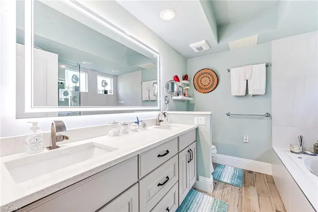Welcome to your tropical retreat in the Pelican Bay beachfront community! This beautifully updated two-bedroom, two-bath condo offers an expansive floor plan. The living room flows seamlessly into the lanai to enjoy the beauty of the Naples foliage in the morning with coffee or at night with friends and cocktails. The lanai is a serene space with sliding glass doors on both sides and screens to enjoy the fresh air. The updated kitchen features contemporary cabinetry, sleek quartz countertops, a farmhouse sink and high-quality appliances, making it easy to prepare something special for guests. The oversized primary bedroom suite is a sanctuary, featuring a large walk-in closet, en-suite bath with a spa-like feel, complete with plenty of counter space, dual sinks, a luxurious soaking tub and a glass enclosed shower. The generously sized guest bedroom allows for two full-size beds or up to a king size and includes two large organized closets allowing plenty of room for guests or a home office. Every detail of this home has been designed to offer a relaxing space after a day at the private beach, golf, tennis, pickleball or shopping. The ample storage options include a large storage closet for all your sports gear, bicycles, golf clubs, luggage and holiday decor. In addition, residents enjoy a refreshing swim in the sparkling lakeside pool at Willow Brook. Willow Brook is pet-friendly, allowing two pets per condominium with no weight restrictions, owners will keep their pets on a leash during walks. In addition, they have one of the lowest HOA fees in Pelican Bay. They boast a strong rental history, with first floor condominiums renting for up to $8,000 per month during peak season. When you are ready to head out on the town, your covered parking space is just a short distance away, with guest parking also nearby. As a resident in Pelican Bay, you will have access to an impressive range of amenities and social activities. Enjoy private beach access with complimentary chair and umbrella service overlooking miles of the Gulf coastline, two amazing private beachfront restaurants, 26 tennis courts, a fitness center, a community room for social gatherings and coming soon 20 pickleball courts. Pelican Bay golf courses are accessible with a Club Pelican Bay membership. A vibrant, friendly community which hosts regular social events, offering plenty of opportunities to meet your neighbors and engage in community activities.