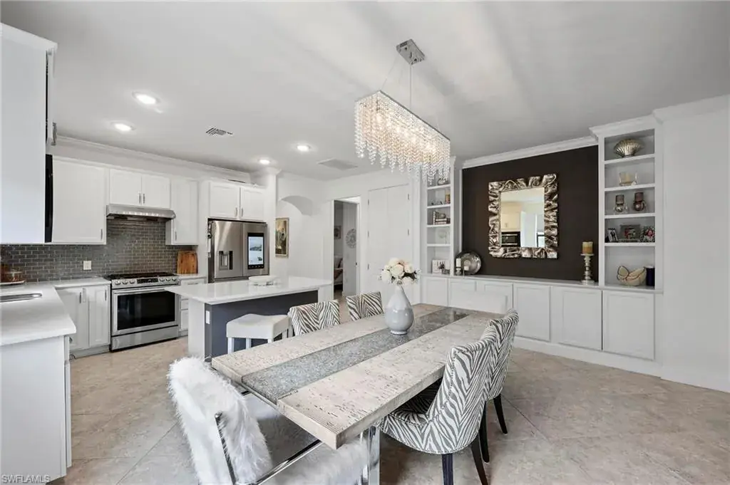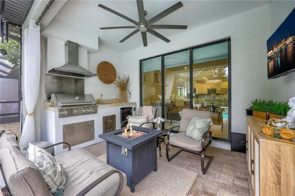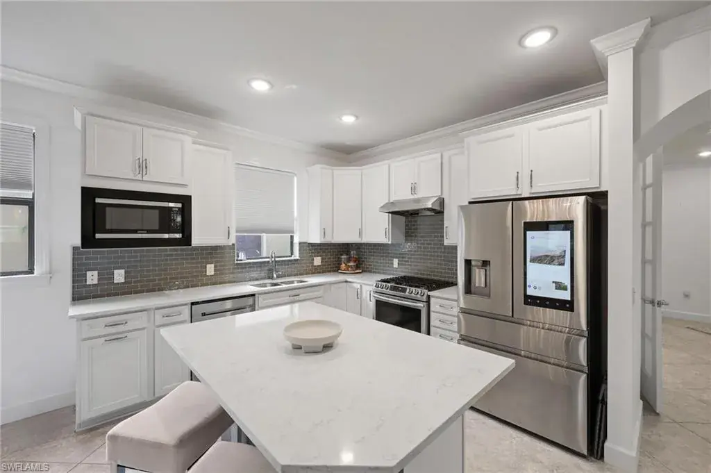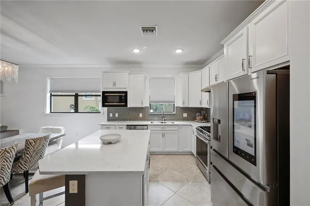 The gas-heated pool invites you to relax in your own private oasis, while the outdoor kitchen transforms casual gatherings into memorable evenings under Florida’s open skies. Indoors, the chef’s kitchen makes a bold statement with sleek Samsung appliances and striking quartz countertops.