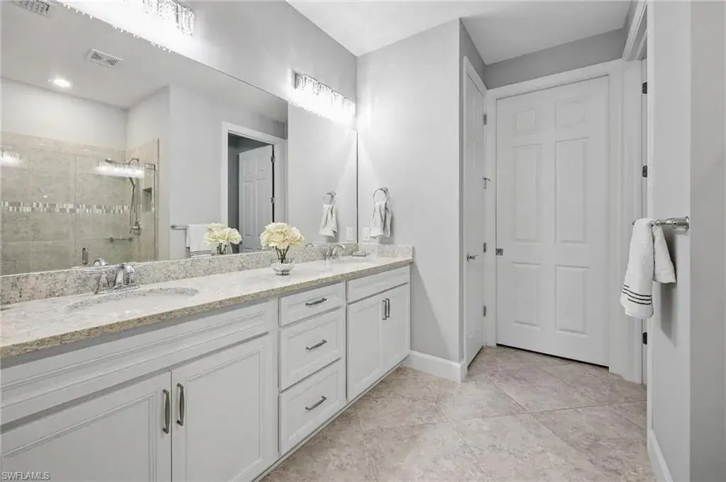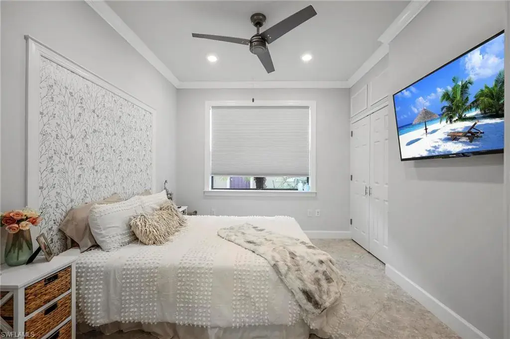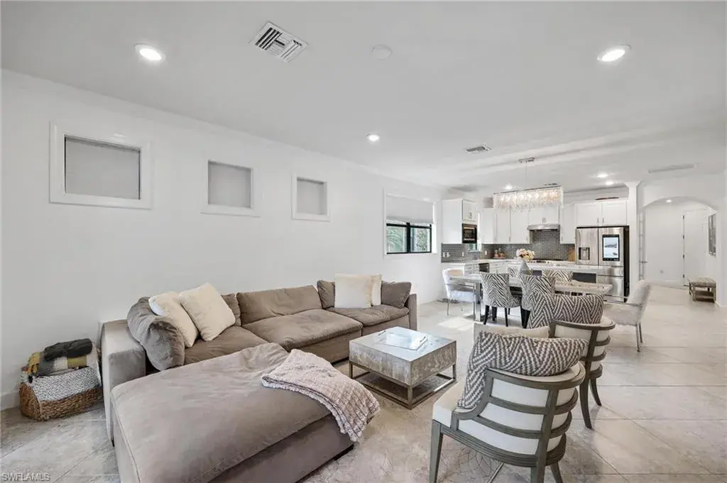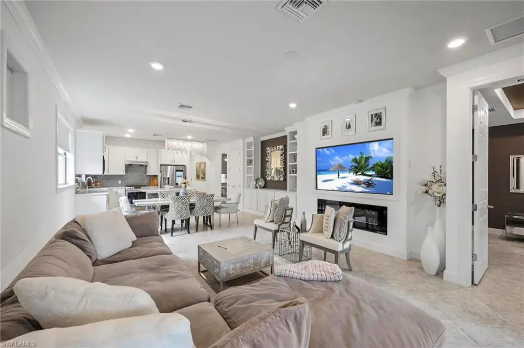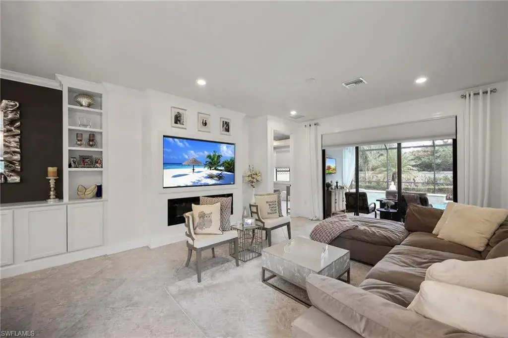 The gas-heated pool invites you to relax in your own private oasis, while the outdoor kitchen transforms casual gatherings into memorable evenings under Florida’s open skies. Indoors, the chef’s kitchen makes a bold statement with sleek Samsung appliances and striking quartz countertops.