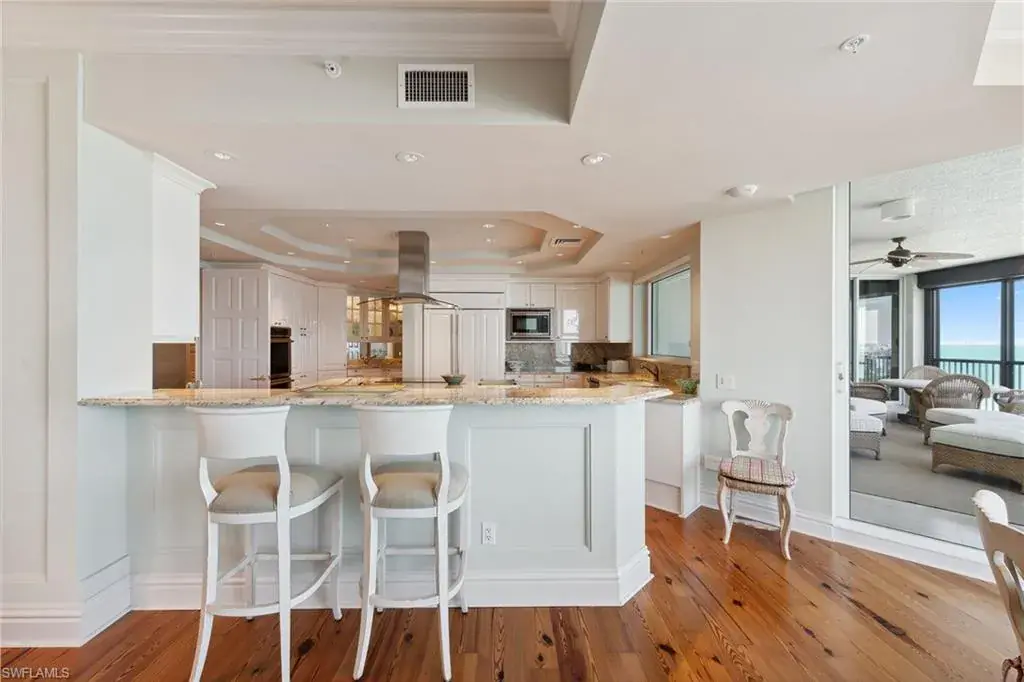 On pristine beach sands of the prestigious, private, gated enclave of Bay Colony. The Windsor epitomizes luxury coastal living. Upon arrival, the private elevator opens to reveal breathtaking, uninterrupted panoramic views. The residence boasts an impressive 6,085 square feet of thoughtfully designed living space, complemented by three generous lanais inviting you to savor spectacular sunrises and sunsets every day of the year. The meticulously crafted floor plan features spectacular reclaimed wood floors throughout the entire residence from an original historic Sears building in Chicago, a luxurious primary suite with dual baths, three guest bedrooms all with en suites, a versatile office with bonus Gulf view, and a chef’s kitchen that seamlessly flows into the inviting family room and breakfast nook. The decor and style have been expertly created to be soothing and warm. The Windsor has undergone a complete transformation offering unparalleled amenities designed to elevate every aspect of your lifestyle. These include 24-hour staffed concierge desk, a well-appointed conference room and elegant social lounge, a resort-style pool, a state-of-the-art fitness center and three charming guest villas for your visitors.