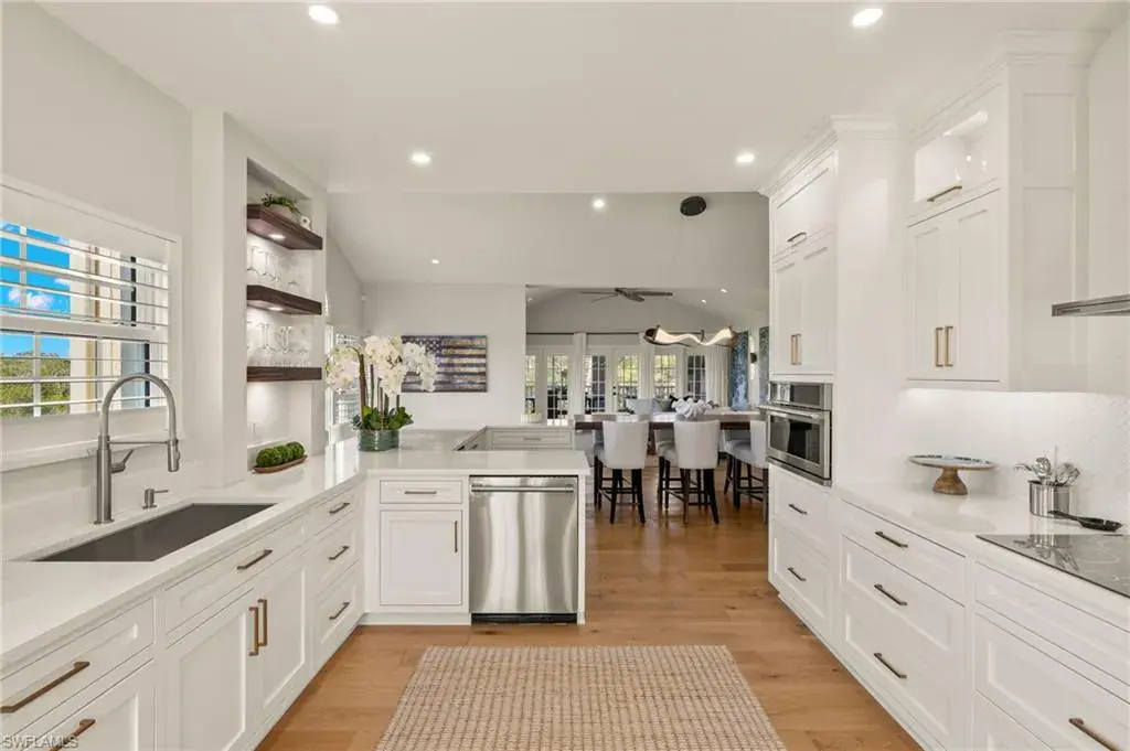 Welcome to 4460 Yacht Harbor Drive in desirable Windward Cay enclave in Windstar on Naples Bay. If you are considering Gulf Shore Boulevard, Moorings or Park Shore condo living Windstar offers the waterfront lifestyle while being set back and protected from the bay for true peace of mind. This stunningly redesigned and fully renovated corner end-unit penthouse unit is located in a boutique 6-unit elevator building with only 2 units per floor and features 2 Bedrooms and 2 Baths in almost 2200 square feet of truly luxurious living space. Enter into a welcoming foyer to a truly fabulous open-concept living space with a contemporary light and airy vibe with soaring vaulted ceilings and stunning natural views all around. Spacious living room with walls of glass boasting unparalleled Audubon Society-certified views overlooking the serene 8th fairway, lake and tropical mangroves. A true chef’s eat-in kitchen replete with custom shaker cabinetry, GE Monogram stainless steel appliances, pot filler, contemporary quartz countertops, open shelving with lighting, breakfast bar and custom built-in Brazilian walnut dining table ideal for daily dining and entertaining. Custom built-in office nook ideal for today’s work from home lifestyle. Convenient laundry room with side by side washer/dryer, custom built-in cabinetry and counter affording great storage. Master suite oasis features spacious bedroom, access to lanai, dual walk-in closets with California custom built-ins and a spa-like master bath with a gorgeous oversized walk-in shower with dual rain heads, contemporary floating double vanity and freestanding soaking tub. Large guest bedroom with a gorgeous view plus a lovely full hall bathroom. Oversized covered parking for 2 vehicles and electrical outlet for your golf cart. No expense spared in this truly custom renovation with the finest of materials and craftsmanship a rarity to find this level of high-design and finish in a condo in Windstar. Windstar on Naples Bay is the only gated golf community with Tom Fazio designed 18-hole golf course that offers direct bay access, a private beach plus dock on Keewaydin Island with seasonal October-July boat shuttle included in your Windstar HOA plus a full service 73-slip deep water marina. Newly renovated clubhouse (separate membership) with multiple dining areas with stunning views of Naples Bay and Port Royal, billiards room, 6 Har-Tru tennis courts, 3 bocce courts and a state of the art fitness center slated for 2026 completion. Preferred location just a short 2 mile drive via car, bike or golf cart to downtown’s 5th Avenue South and 3rd Street South known worldwide for its fine dining, shopping and beaches. Situated in the vibrant Bayshore Arts District, Windstar is walkable to Naples Botanical Garden and Naples Pickleball Center home of the pickleball US Open. Easy access to I-75, Naples and Fort Myers airports.