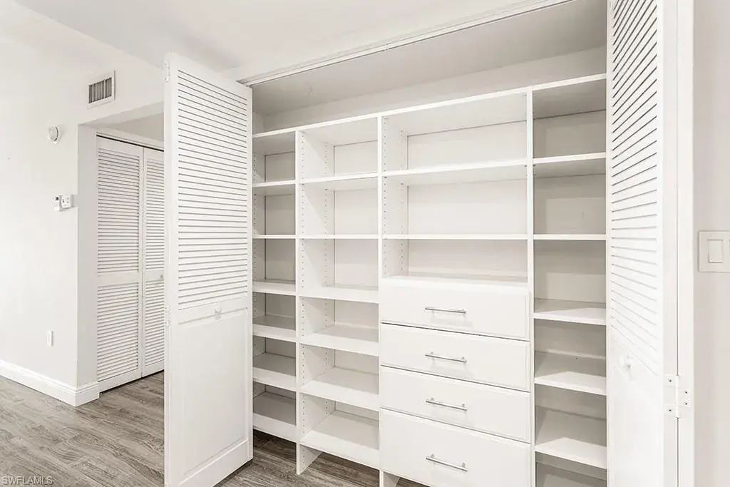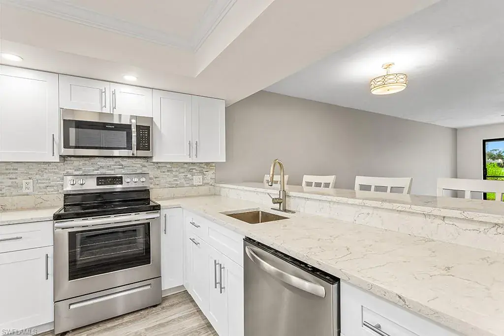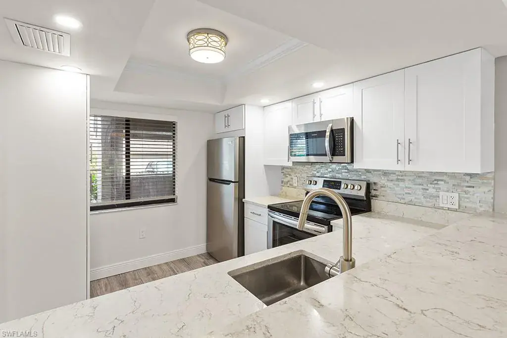 This beautifully remodeled 1st floor residence features extensive upgrades throughout, including a modernized kitchen with quartz countertops, stainless-steel appliances, decorative lighting and plumbing fixtures. Stylish water resistant wood-based laminate flooring and custom pavers on the newly screened-in lanai area, perfect for al fresco dining and enjoying picturesque views of Royal Palm Golf Club. Thoughtful touches include closet organizers and plantation shutters, adding elements of both convenience and style. Owners of this Pet-Friendly residence enjoy special access to a secured 1 CAR Garage with a lot of extra storage. Located approximately 5 miles to fashionable 5th Avenue South Dining and Shopping and the pristine Gulf beaches.
